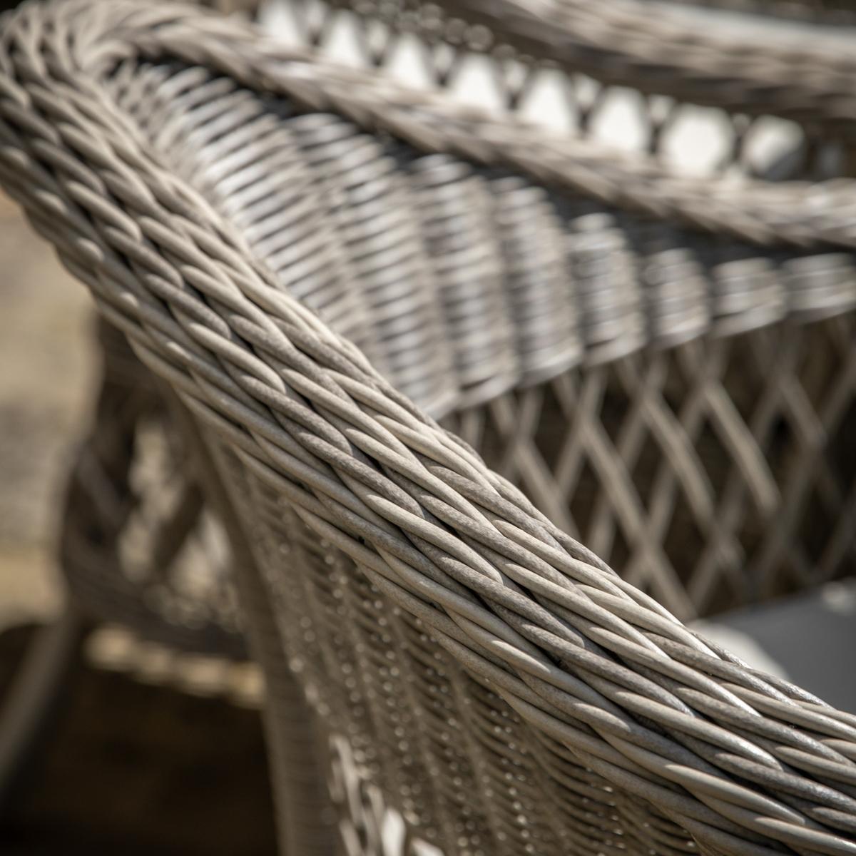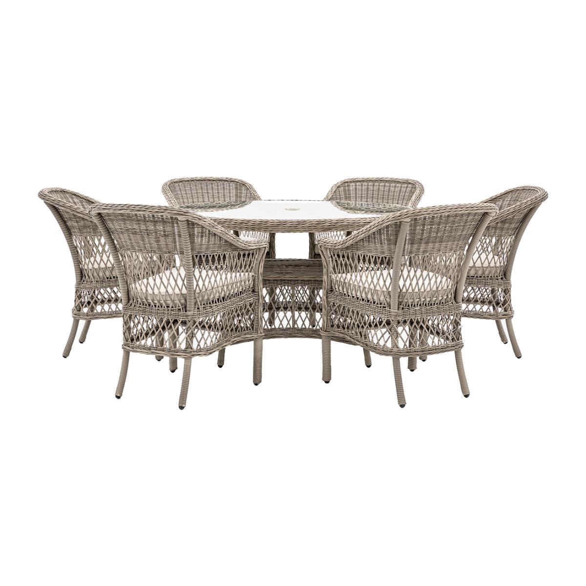 Linger over lunch in the summer sun. Woven from all-weather PE rattan the vintage style pattern is full of charm, you won't be able to resist lingering longer than your should. With a glass-topped table and showerproof cushions.