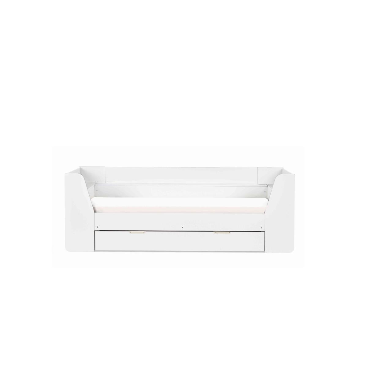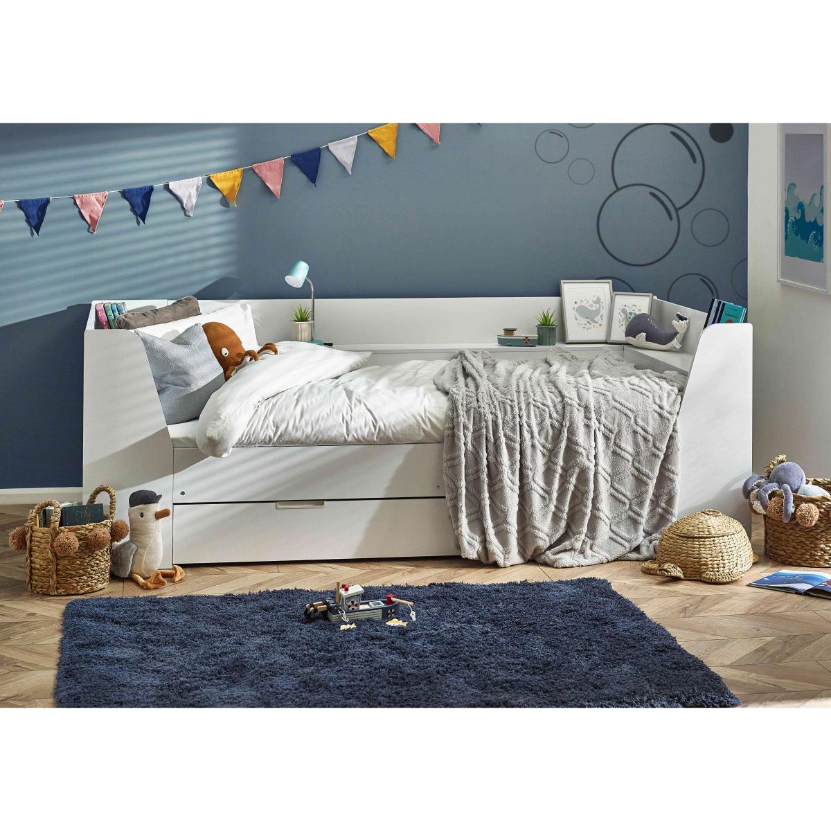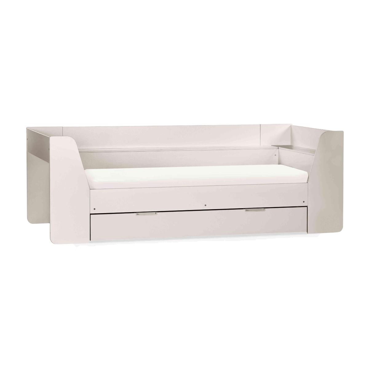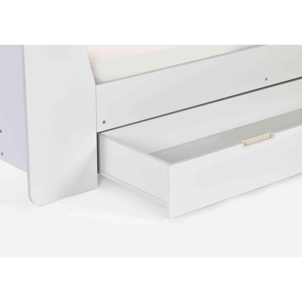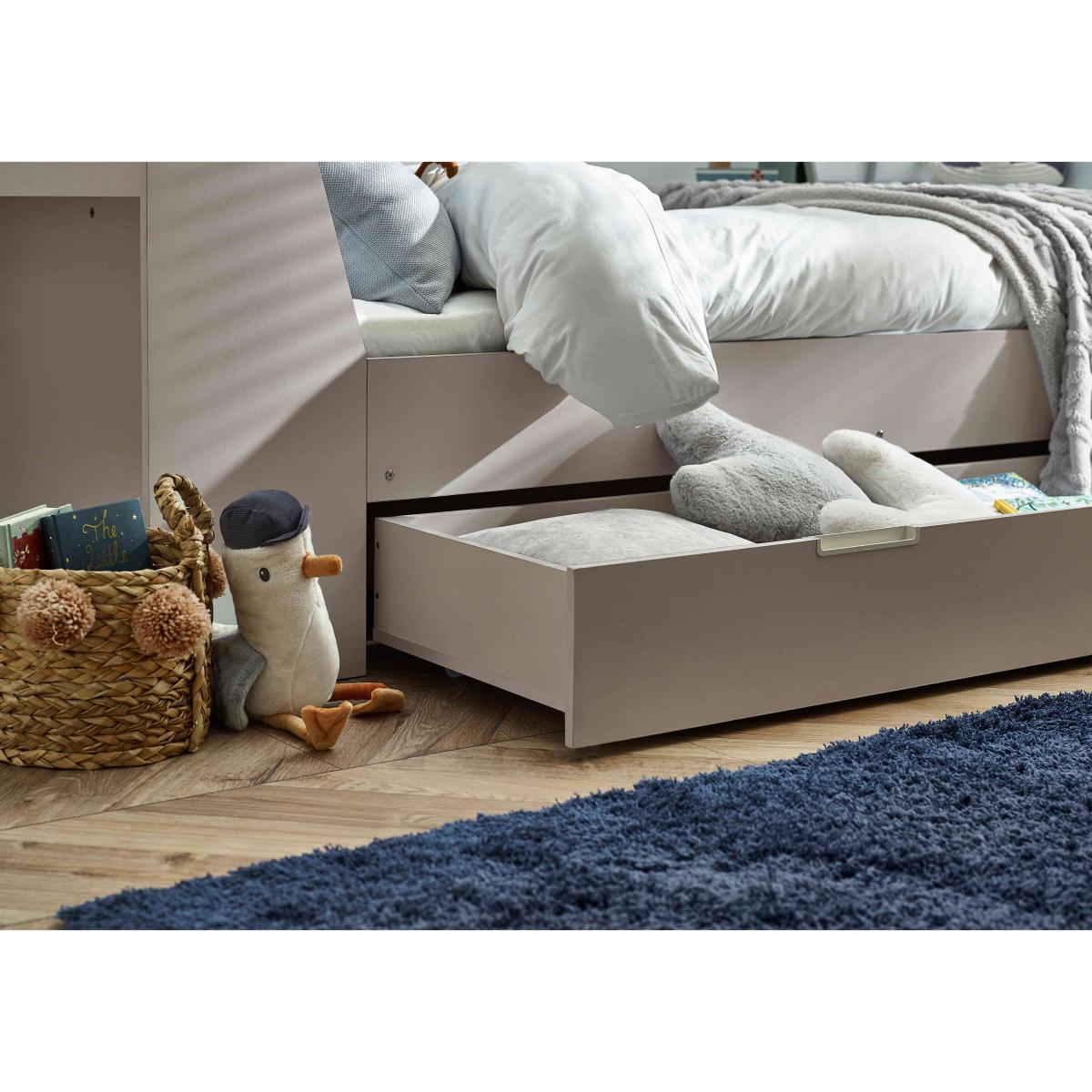 Cosy yet practical, the Linnea Daybed has plenty of storage space while still offering a comfy bed for your little one. Why you'll love it Stow blankets and bedding with the large pull-out drawer. Crafted from sturdy materials and built to last. Shelving unit is ideal for organising books and pictures. Available in 2 stylish finishes, white and taupe. We also offer a range of kids mattresses that’ll fit perfectly. This daybed is part of our kids bedroom range from Julian Bowen. What you need to know This bed is not supplied with a mattress included. This product is suitable for children aged 6 and over. Please note this item is self-assembly and will take approximately 120 minutes to assemble. Maximum safe mattress depth is 17 cm. Clearance of 10 cm is required either end for assembly.