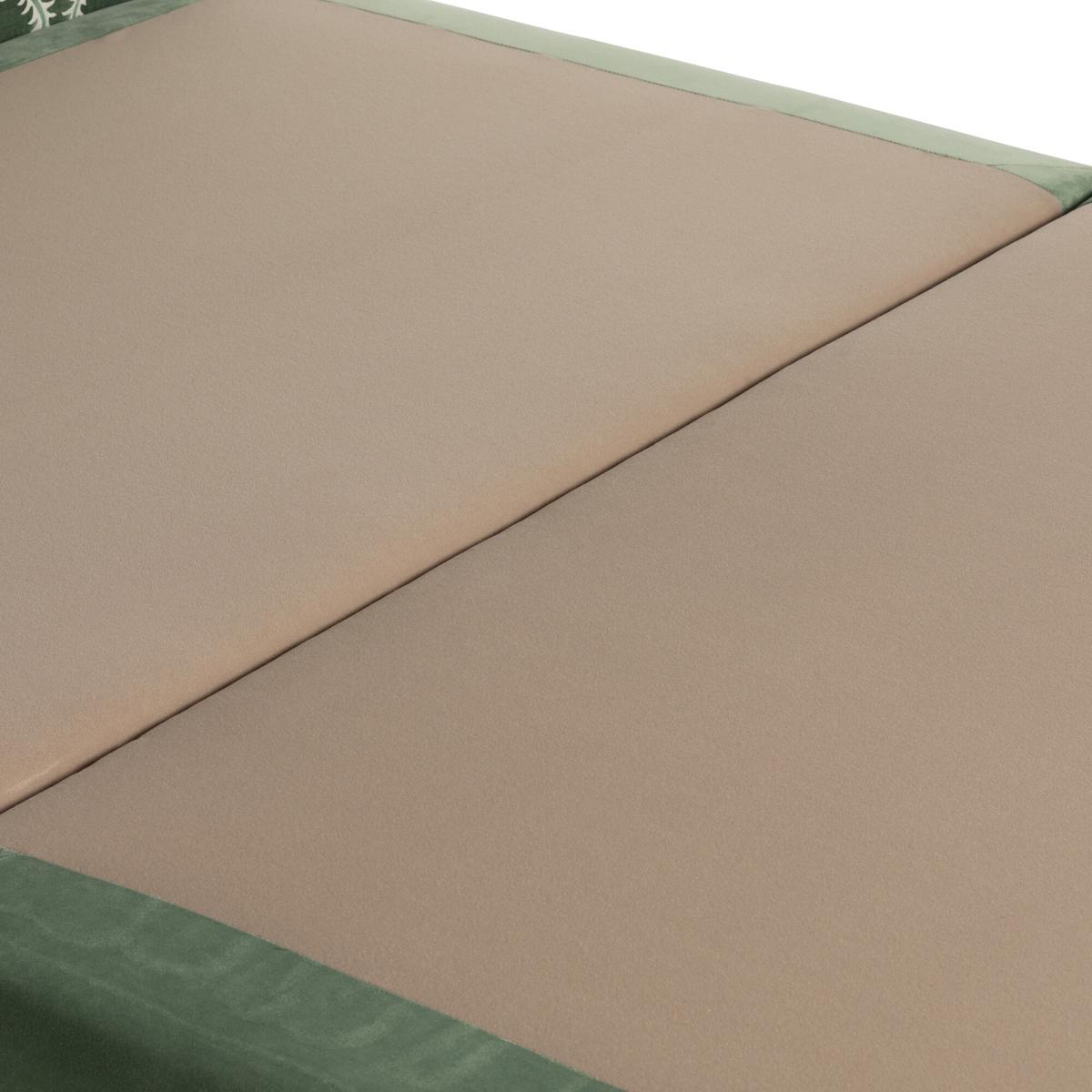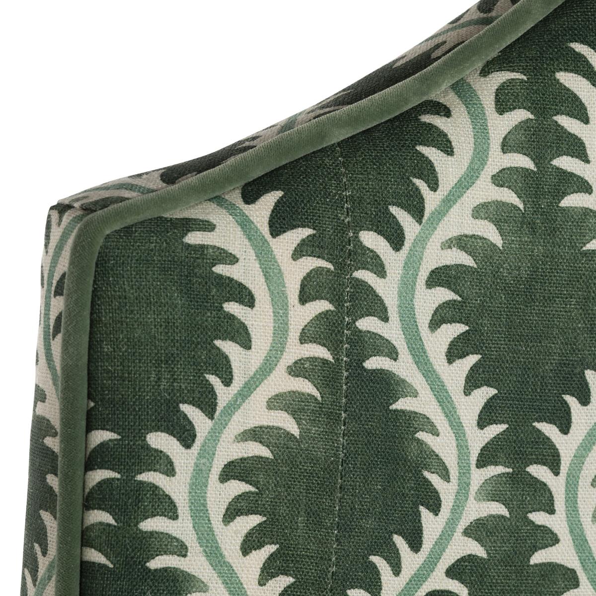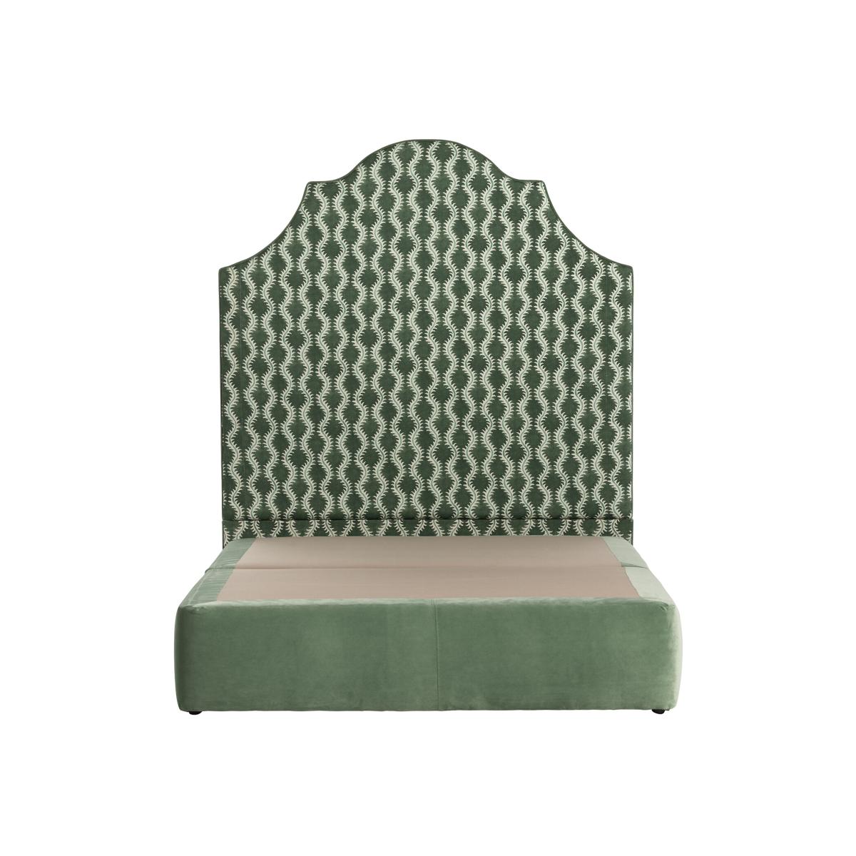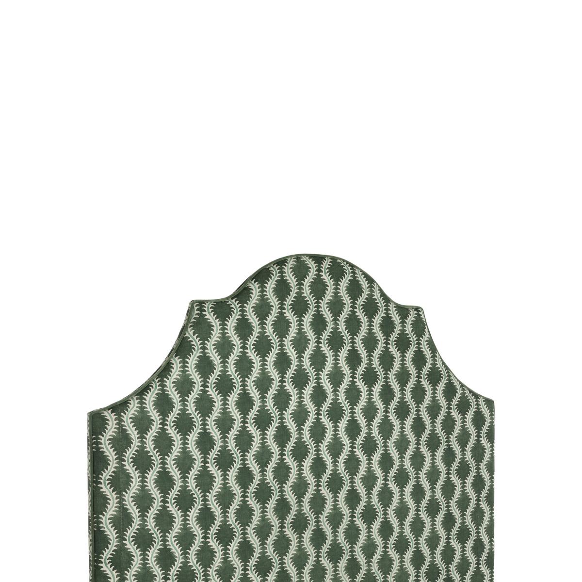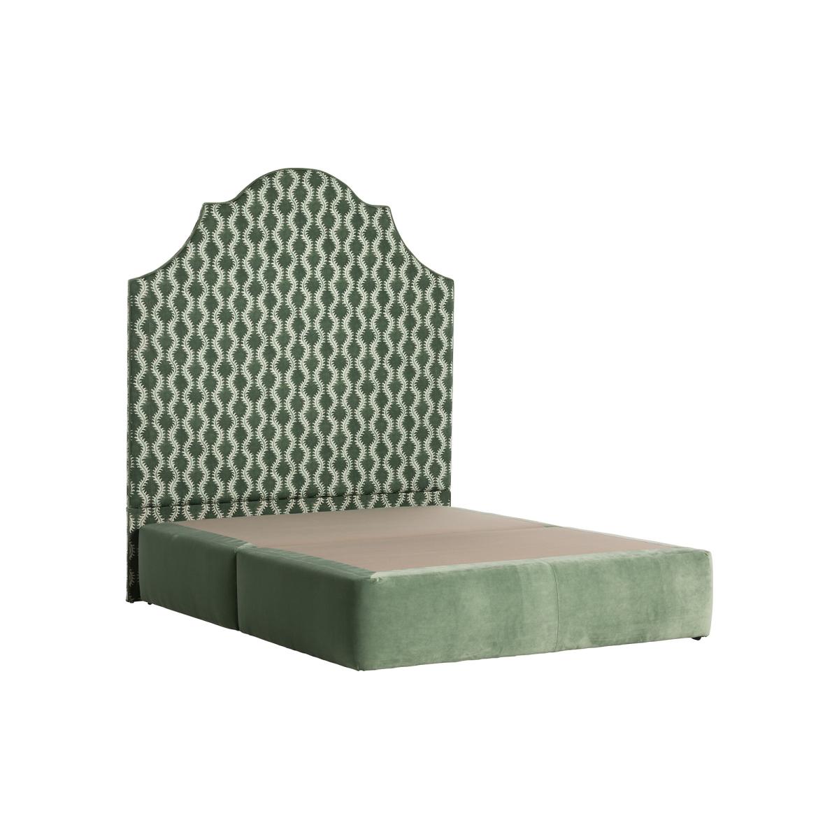 This king size divan base and headboard set combines comfort and elegance. The base is wrapped in soft velvet for a luxurious touch, while the headboard features a bold patterned fabric in rich green tones. Velvet piping frames the design, adding a refined finish. With its graceful curves and striking style, this piece makes a stunning bedroom centerpiece. Blending timeless charm with modern comfort, it’s the perfect way to bring sophistication and warmth to your space.