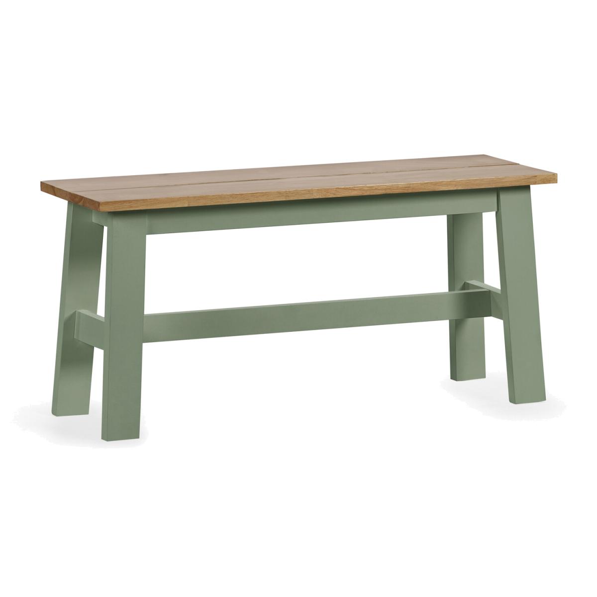 Add a touch of relaxed style to your home with this charming dining bench, perfect for casual meals or cosy family gatherings. Featuring a warm natural oak-effect seat and a soft sage green frame, the bench brings a timeless, rustic feel to any space. Its slim, space-saving design allows it to tuck neatly under the table, helping to keep your dining area open and clutter-free. Whether used as everyday seating or an extra spot for guests, this versatile bench is a stylish and practical addition to any room. Table and chairs sold separately. Partial assembly Required.