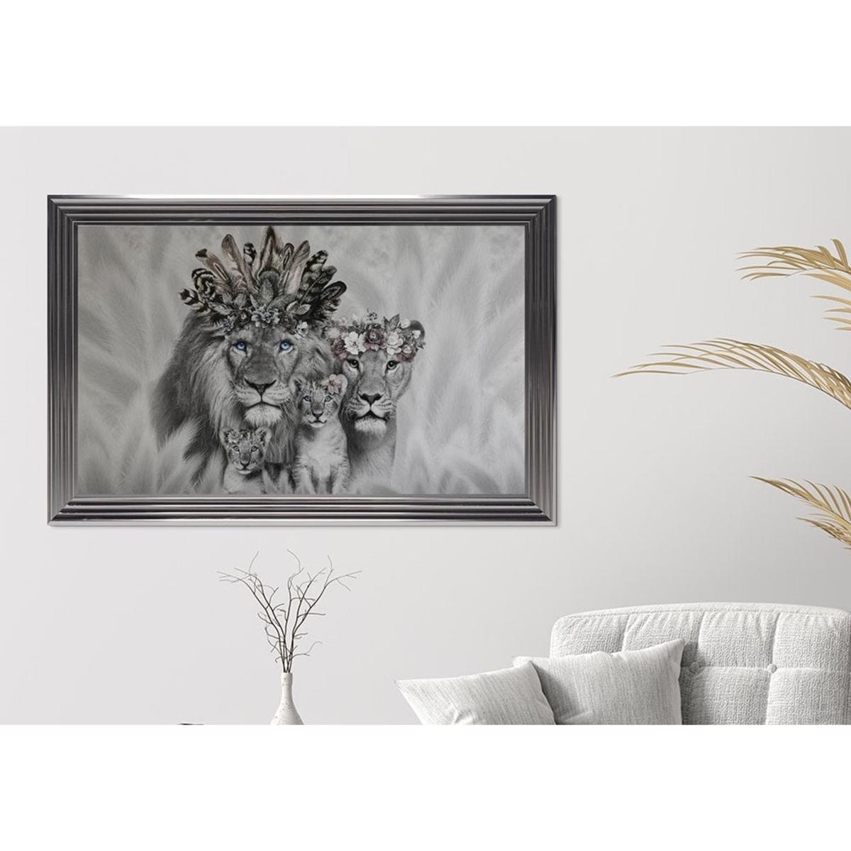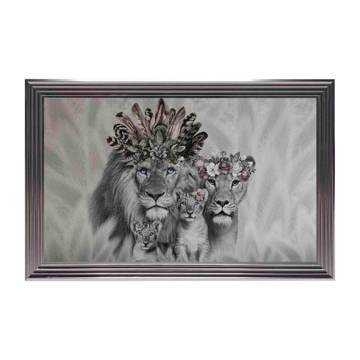 Capturing the powerful lion spirit, this Lion Family 2 Framed Art will lead the style of any interior. Make your walls roar and any head turn with this statement piece. Why you'll love it. Unique and eye-catching modern artwork. Elegantly framed in a metalic frame. Made in the UK. What you need to know. A paper print on an MDF back board. Hand embellished piece. Dimensions. Height: 74 cm (30 in). Width: 114cm (45 in).