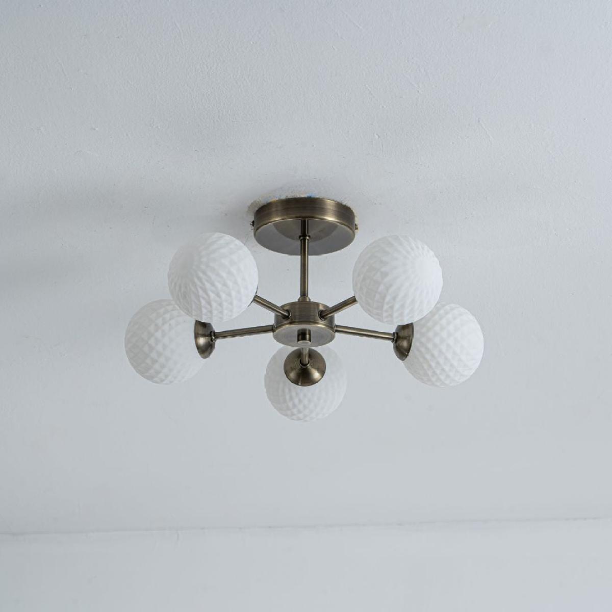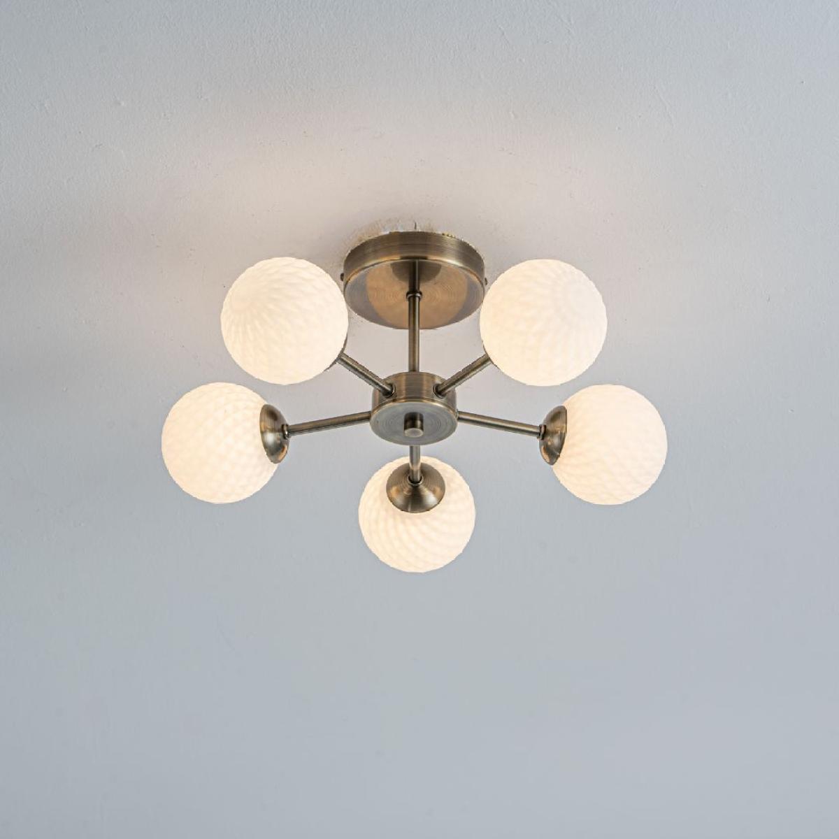 Elevate your interior with the timeless charm of the Lior 5-Light Antique Brass Semi-Flush Ceiling Light, a Pagazzi Lighting exclusive. Designed to blend vintage style with modern functionality, this ceiling light features five beautifully textured glass shades, evenly spaced for optimal illumination. The elegant antique brass finish complements both classic and contemporary décors, while the semi-flush design makes it an ideal choice for rooms with lower ceilings. The frosted, patterned glass shades provide a soft, diffused glow—perfect for creating a warm and welcoming atmosphere in living rooms, hallways, or bedrooms. Classic design meets modern practicality with the Lior range—perfect for adding character and warmth to your home.