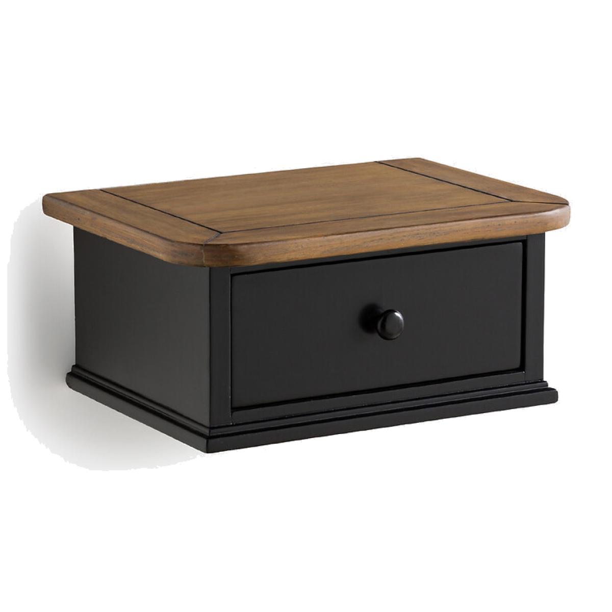 Lipstick wall-mounted bedside table. A beautifully crafted, typically French design : The Lipstick bedside table is wall-mounted and combines elegance with a very practical drawer. Product Details • 1 drawer • Pine and black-lacquerd MDF, nitrocellulose varnish finish • Dark oak-stained, brushed pine shelf • Fixes to the wall Dimensions • Length: 38cm • Height: 17cm • Depth: 28cm • Dimensions. inner drawer space : L26 x H8 x D15.5cmDelivery:. Sold pre-assembled. It will be delivered to your door. Note! Please check that all access points are large enough to accommodate your delivery (doors, stairs, lifts).Parcel dimensions and weight:1 parcel • L44 x H23 x D34cm • 6kg