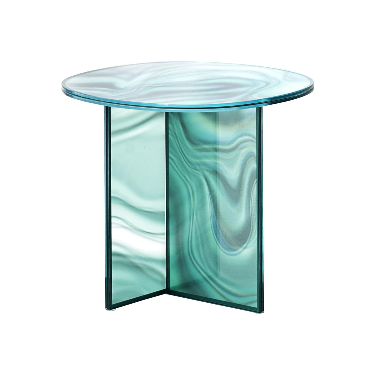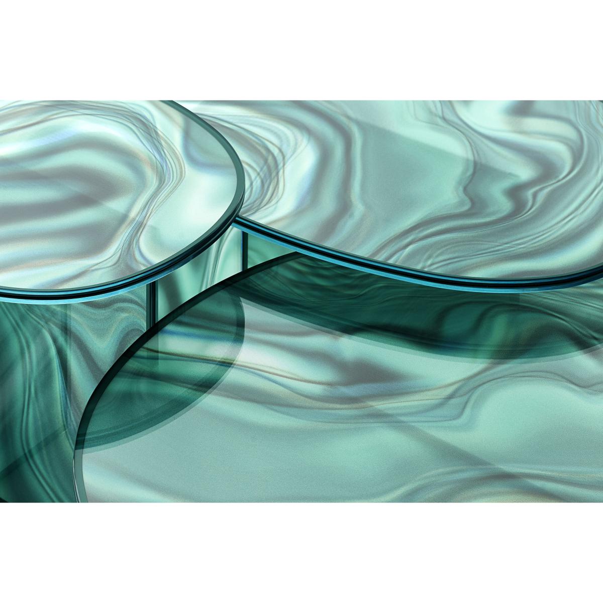 A magical creation by the Grand Priestess of Design: Patricia Urquiola! Highly decorative, the Liquefy glass table collection presents a stunning veined and organic pattern that reproduces the veining found in marble. The appearance of these poetic glass tables is transformed, depending on where you look at it from: A magical effect! The marbled patterns vary depending on the light and the viewing angle, creating a play of interactions with the observer. The perception of this decorative piece changes, giving the impression of a sculpture in constant motion. This incredible, kinetic effect is made possible through the mastery of glass-working techniques. Each surface is composed of two tempered glass tabletops, decorated overlaid in an irregular fashion, bringing this psychedelic pattern to life as it expands over the base, which is decorated in the same way. Tabletop and legs complement each other wonderfully, shaping a powerful art-like piece. The decoration is surrounded by a frame, coloured to match the paint around the glass edging.