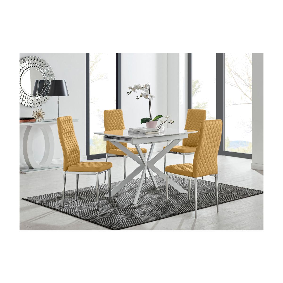This high gloss Lira chrome extending dining table is the perfect solution for an adaptable modern home. Its size fits snug in a small space and extends from 100cms to 140cms to bring a fresh and vibrant feel to your dining space. But this high gloss table is as functional as it is stylish. The eye-catching gloss finish is easy to wipe clean, making it a versatile family-friendly investment. Plus, the four white burst legs are specially positioned to accommodate the extension of the dining table, allowing for more space and extra chairs. The extending function is simple. The table top separates on a smooth sliding mechanism with the extension pieces cleverly concealed underneath. This lifts out easily to unfold and create additional space, enough to fit four people around in comfort, and up to six people when extended. Upholstered in soft touch mustard yellow velvet and finished with diamond pattern stitching the Milan dining chairs would seamlessly fit in with most dining spaces, whilst not compromising on either style or comfort. The stylish shiny chrome silver leg and hatched velvet combination gives this chair a contemporary edge, whilst it's simple design allows for practical everyday usage. The chairs are made from high quality durable velvet that's easy to keep clean and are ergonomically designed for maximum comfort and support. They feature a deep foam seat cushion and plastic feet to protect the floor from any damage! At an unbeatable price you cannot go wrong with these chairs!
