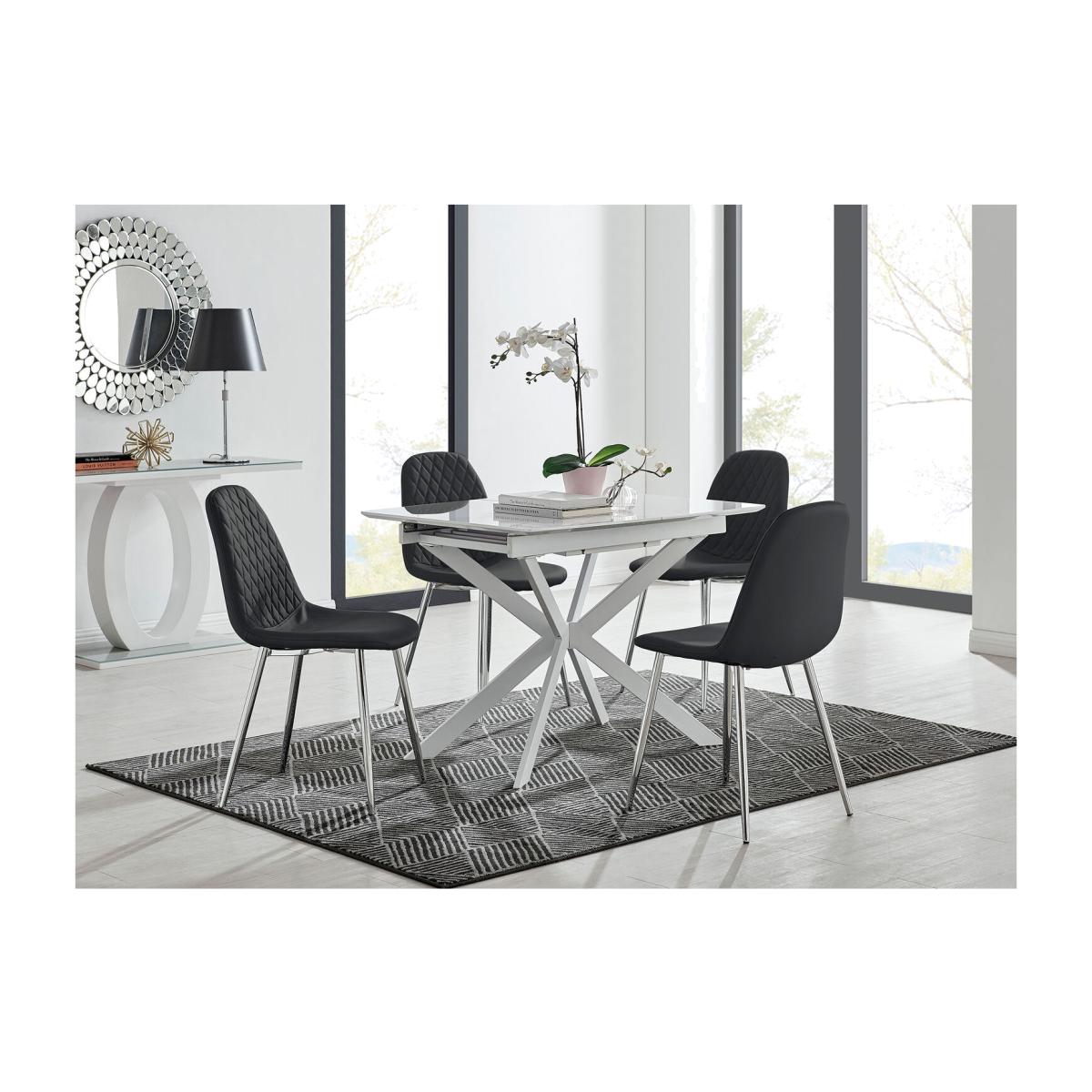 This high gloss Lira chrome extending dining table is the perfect solution for an adaptable modern home. Its size fits snug in a small space and extends from 100cms to 140cms to bring a fresh and vibrant feel to your dining space. But this high gloss table is as functional as it is stylish. The eye-catching gloss finish is easy to wipe clean, making it a versatile family-friendly investment. Plus, the four white burst legs are specially positioned to accommodate the extension of the dining table, allowing for more space and extra chairs. The extending function is simple. The table top separates on a smooth sliding mechanism with the extension pieces cleverly concealed underneath. This lifts out easily to unfold and create additional space, enough to fit four people around in comfort, and up to six people when extended. With a perfect balance of pattern and texture the new Corona Chair is a statement piece ready for the modern dining space. The trendy chrome legs are all the rage and offer a perfect way to add an accent of lustre to your home. The Scandi-style faux leather seat with diamond pattern stitching is a unique take on a classic design offering comfort and durability for everyday use.