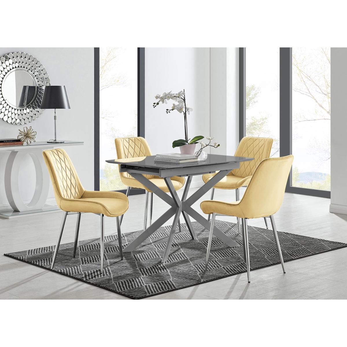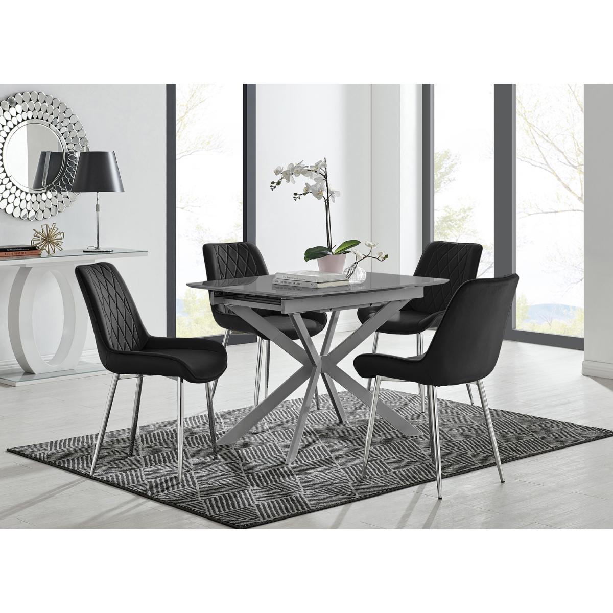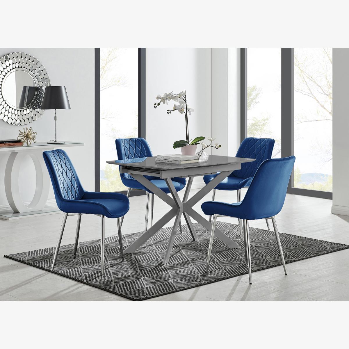 The Lira table is the perfect solution for the adaptable modern home. Extending effortlessly from 100cms to 140cms and with a family-friendly wipe-clean high gloss surface, you'll be hard-pressed to find a more stylish and versatile dining table. The four grey burst legs add an element of luxury and are cleverly positioned to accommodate the extending element for extra chairs. The table-top separates on a smooth sliding mechanism with the extension piece concealed under the top, lifting out easily to unfold and create the additional length in the extended table. Modernise your dining area with our luxurious velvet upholstered Pesaro Dining Chairs. With a nod to the Mid-century modern design era, the Pesaro features gorgeous textured diamond stitching with an ergonomically designed curved seat pad blending seamlessly to the supporting medium high back rest. Sat atop elegant slightly tapered legs in black, chrome or gold effect. The Pesaro is a perfect match to any dining table or use as a luxe vanity seat in the bedroom, as an occasional chair for the living area or to add a bit of luxury to your home office.