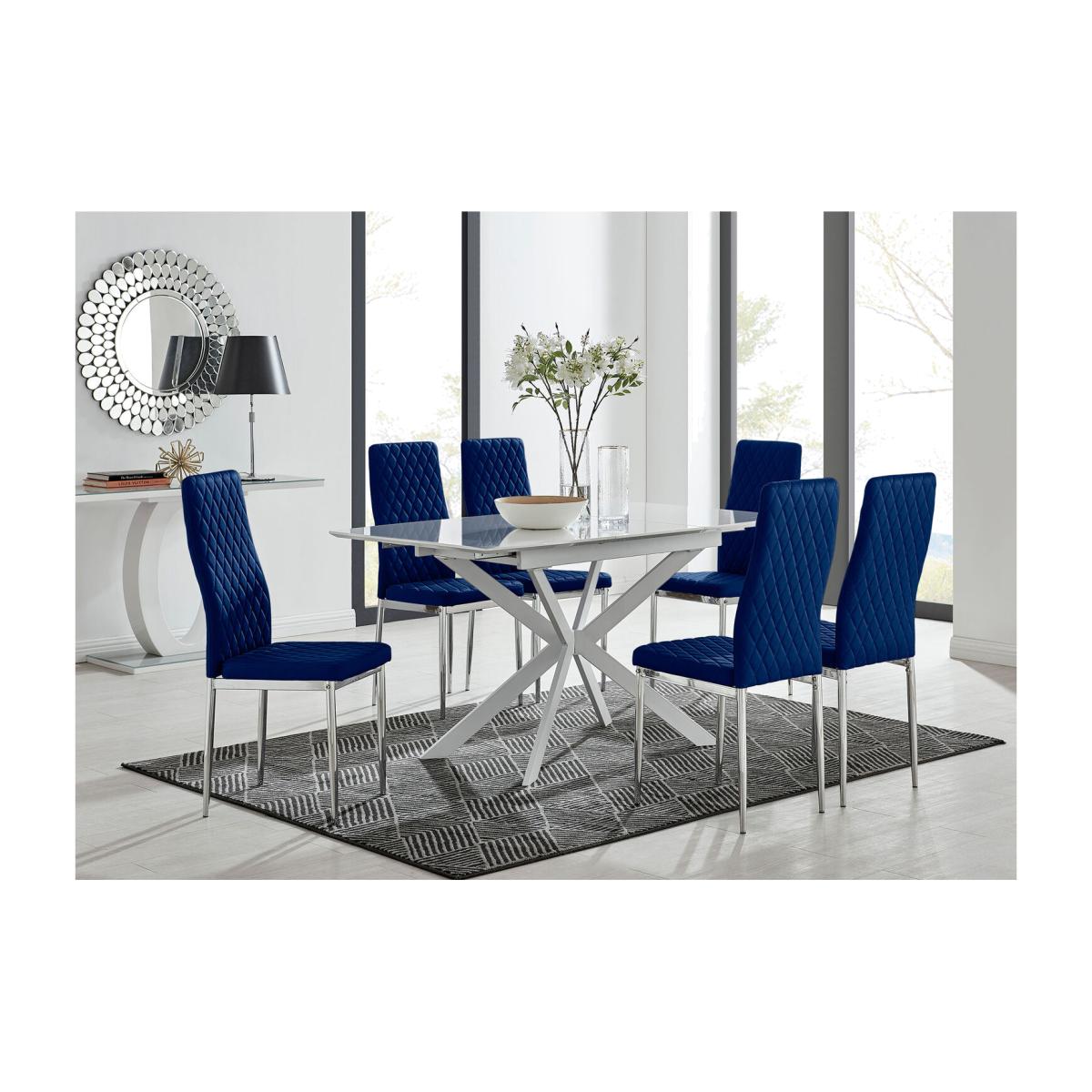 A Lira large white gloss and chrome extending dining table is a stylish solution for the dining room in your adaptable modern home. Lira white gloss dining tables are high-quality extension pieces. They are designed by one of the world's top dining furniture brands to bring functionality and style to your dining space. This high gloss table top separates on a smooth sliding mechanism, lifting out easily to unfold and create more space for the whole household. It extends effortlessly from 120cms to 160cms, plus the family-friendly high gloss finish makes the table easy to wipe clean. High gloss dining tables in the Lira collection also have four white burst legs to add an element of luxury and sophistication. They are cleverly positioned to accommodate additional dining chairs when the table is extended. If you're searching for high gloss dining tables with effortless functionality, look no further. This stylish extendable Lira dining room table makes a wonderful addition to any home. Upholstered in soft touch navy blue velvet and finished with diamond pattern stitching the Milan dining chairs would seamlessly fit in with most dining spaces, whilst not compromising on either style or comfort. The stylish shiny chrome silver leg and hatched velvet combination gives this chair a contemporary edge, whilst it's simple design allows for practical everyday usage. The chairs are made from high quality durable velvet that's easy to keep clean and are ergonomically designed for maximum comfort and support. They feature a deep foam seat cushion and plastic feet to protect the floor from any damage! At an unbeatable price you cannot go wrong with these chairs!