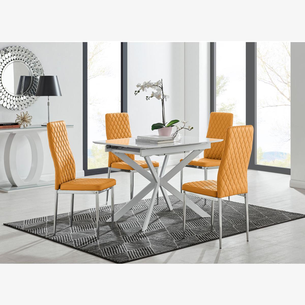 A Lira large white gloss and chrome extending dining table is a stylish solution for the dining room in your adaptable modern home. Lira white gloss dining tables are high-quality extension pieces. They are designed by one of the world's top dining furniture brands to bring functionality and style to your dining space. This high gloss table top separates on a smooth sliding mechanism, lifting out easily to unfold and create more space for the whole household. It extends effortlessly from 120cms to 160cms, plus the family-friendly high gloss finish makes the table easy to wipe clean. High gloss dining tables in the Lira collection also have four white burst legs to add an element of luxury and sophistication. They are cleverly positioned to accommodate additional dining chairs when the table is extended. If you're searching for high gloss dining tables with effortless functionality, look no further. This stylish extendable Lira dining room table makes a wonderful addition to any home. Upholstered in soft faux leather and finished with diamond pattern stitching the Milan dining chairs would seamlessly fit in with most dining spaces, whilst not compromising on either style or comfort. The stylish chrome leg and hatched leather combination gives this chair a contemporary edge, whilst it's simple design allows for practical everyday usage. The chairs are made from high quality faux leather and are ergonomically designed for maximum comfort and support. They feature soft touch faux leather with a deep foam seat cushion and plastic feet to protect the floor from any damage! At an unbeatable price you cannot go wrong with these chairs!