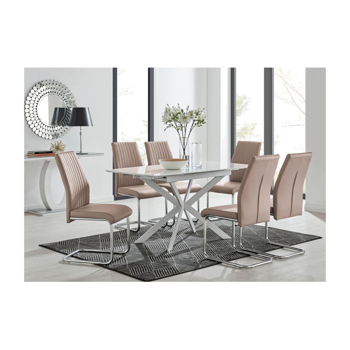 A Lira large white gloss and chrome extending dining table is a stylish solution for the dining room in your adaptable modern home. Lira white gloss dining tables are high-quality extension pieces. They are designed by one of the world's top dining furniture brands to bring functionality and style to your dining space. This high gloss table top separates on a smooth sliding mechanism, lifting out easily to unfold and create more space for the whole household. It extends effortlessly from 120cms to 160cms, plus the family-friendly high gloss finish makes the table easy to wipe clean. High gloss dining tables in the Lira collection also have four white burst legs to add an element of luxury and sophistication. They are cleverly positioned to accommodate additional dining chairs when the table is extended. If you're searching for high gloss dining tables with effortless functionality, look no further. This stylish extendable Lira dining room table makes a wonderful addition to any home. The stylish curved chrome leg and stitched leather combination gives this chair a contemporary edge, whilst it's simple design allows for practical everyday usage. The Lorenzo chairs are made from high quality, soft touch faux leather and are ergonomically designed for maximum comfort and support. Featuring a deep foam seat cushion these chairs are a delight to sit on and the plastic feet protect the floor from any damage! At a truly unbeatable price add some class to your dining room with these Lorenzo dining chairs!