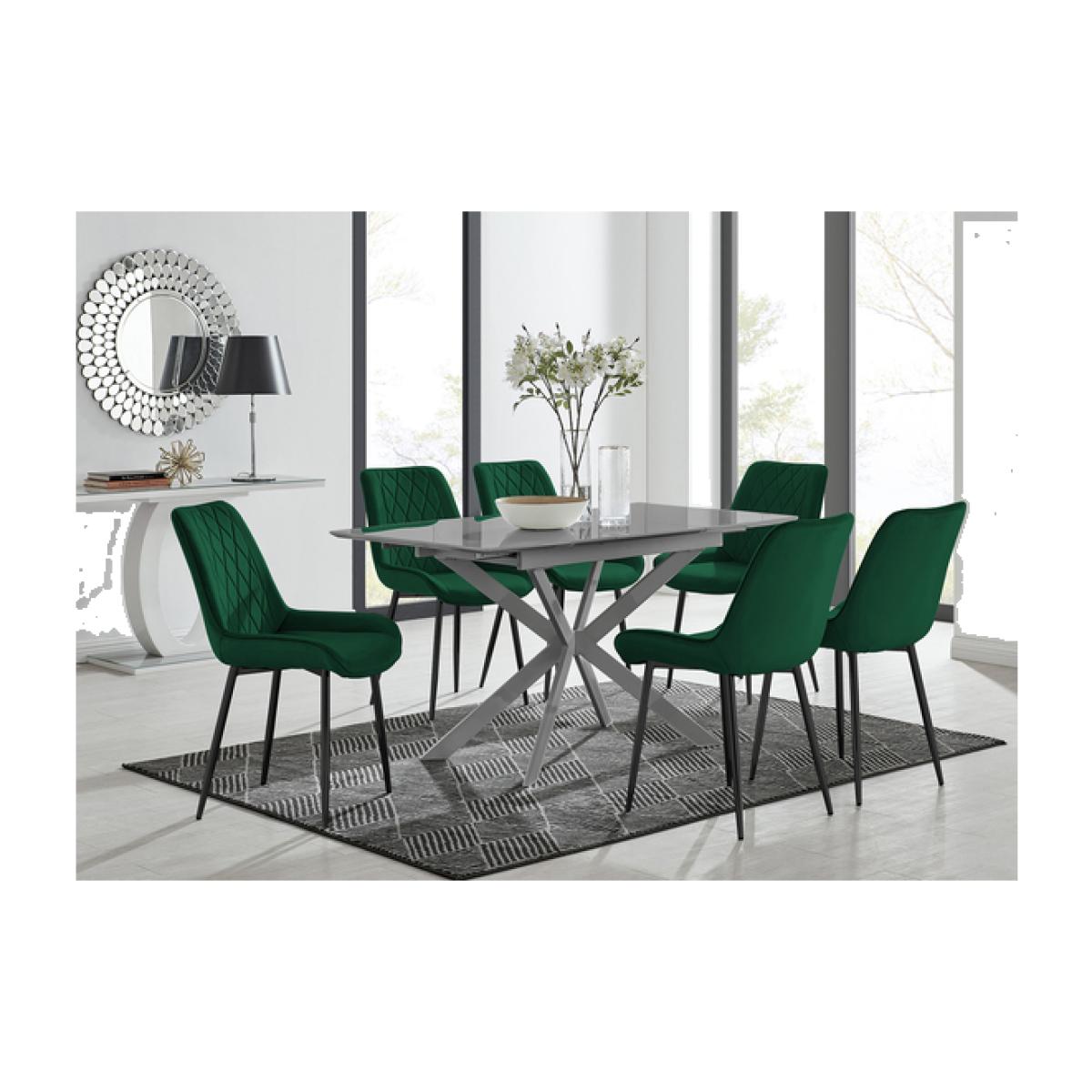 The Lira 6 seater table is the perfect solution for the adaptable modern home. Extending effortlessly from 120cms to 160cms and with a family-friendly wipe-clean high gloss surface, you'll be hard-pressed to find a more stylish and versatile dining table. The four grey burst legs add an element of luxury and are cleverly positioned to accommodate the extending element for extra chairs. The table-top separates on a smooth sliding mechanism with the extension piece concealed under the top, lifting out easily to unfold and create the additional length in the extended table. Modernise your dining area with our luxurious velvet upholstered Pesaro Dining Chairs. With a nod to the Mid-century modern design era, the Pesaro features gorgeous textured diamond stitching with an ergonomically designed curved seat pad blending seamlessly to the supporting medium high back rest. Sat atop elegant slightly tapered legs in black, chrome or gold effect. The Pesaro is a perfect match to any dining table or use as a luxe vanity seat in the bedroom, as an occasional chair for the living area or to add a bit of luxury to your home office.