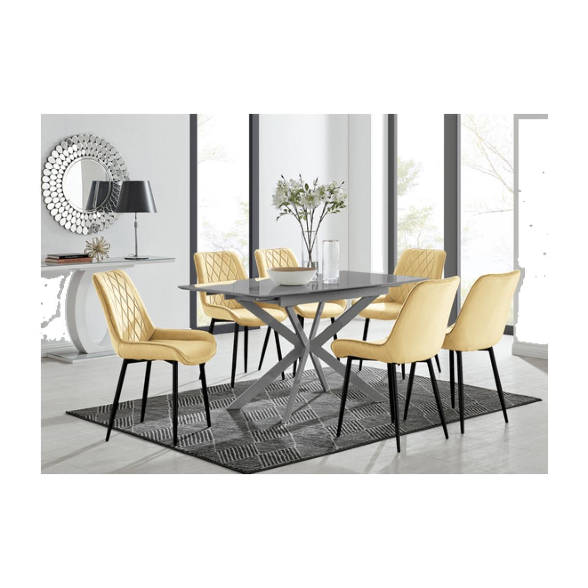 The Lira 6 seater table is the perfect solution for the adaptable modern home. Extending effortlessly from 120cms to 160cms and with a family-friendly wipe-clean high gloss surface, you'll be hard-pressed to find a more stylish and versatile dining table. The four grey burst legs add an element of luxury and are cleverly positioned to accommodate the extending element for extra chairs. The table-top separates on a smooth sliding mechanism with the extension piece concealed under the top, lifting out easily to unfold and create the additional length in the extended table. Modernise your dining area with our luxurious velvet upholstered Pesaro Dining Chairs. With a nod to the Mid-century modern design era, the Pesaro features gorgeous textured diamond stitching with an ergonomically designed curved seat pad blending seamlessly to the supporting medium high back rest. Sat atop elegant slightly tapered legs in black, chrome or gold effect. The Pesaro is a perfect match to any dining table or use as a luxe vanity seat in the bedroom, as an occasional chair for the living area or to add a bit of luxury to your home office.