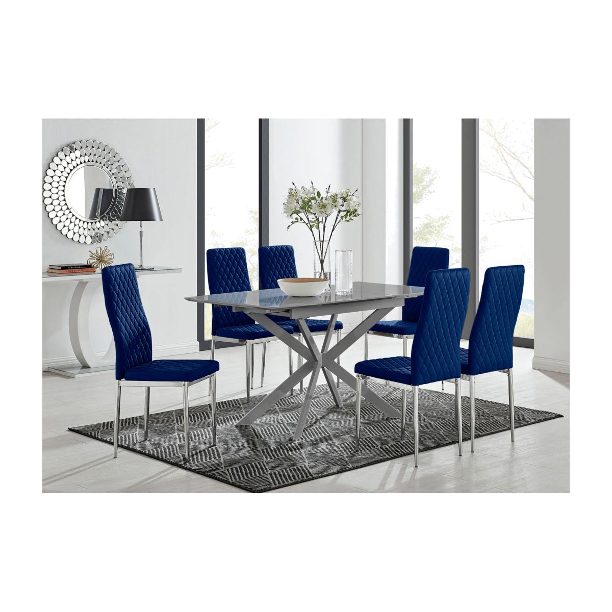 The Lira 6 seater table is the perfect solution for the adaptable modern home. Extending effortlessly from 120cms to 160cms and with a family-friendly wipe-clean high gloss surface, you'll be hard-pressed to find a more stylish and versatile dining table. The four grey burst legs add an element of luxury and are cleverly positioned to accommodate the extending element for extra chairs. The table-top separates on a smooth sliding mechanism with the extension piece concealed under the top, lifting out easily to unfold and create the additional length in the extended table. Upholstered in soft touch navy blue velvet and finished with diamond pattern stitching the Milan dining chairs would seamlessly fit in with most dining spaces, whilst not compromising on either style or comfort. The stylish shiny chrome silver leg and hatched velvet combination gives this chair a contemporary edge, whilst it's simple design allows for practical everyday usage. The chairs are made from high quality durable velvet that's easy to keep clean and are ergonomically designed for maximum comfort and support. They feature a deep foam seat cushion and plastic feet to protect the floor from any damage! At an unbeatable price you cannot go wrong with these chairs!