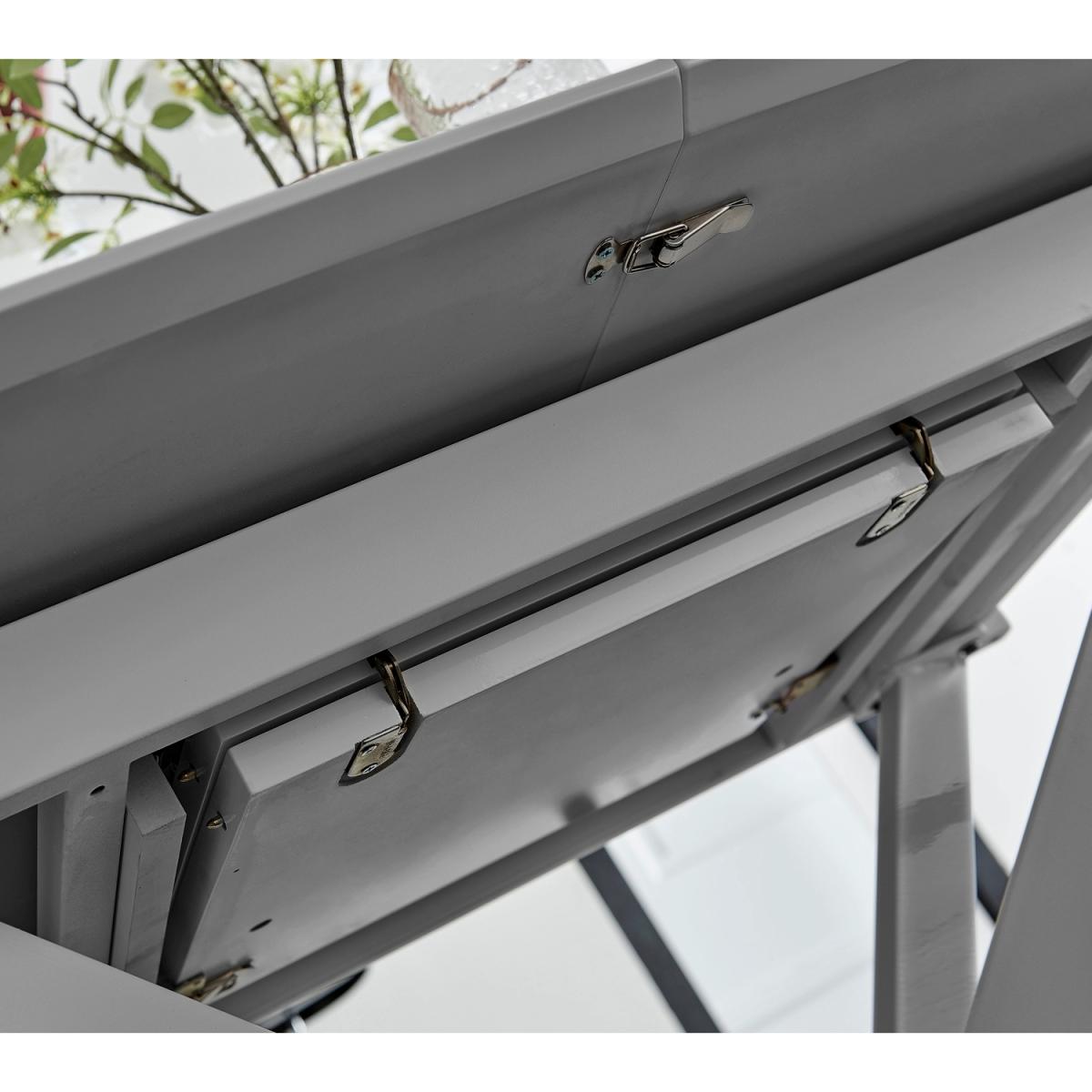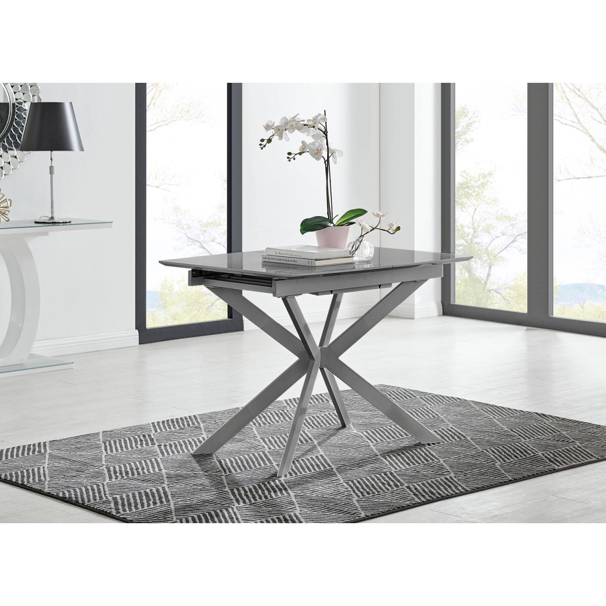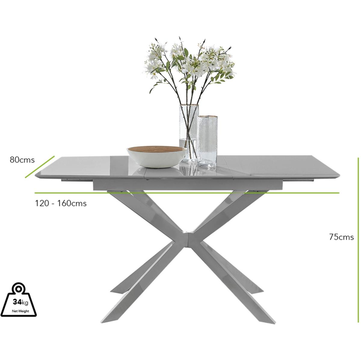 The Lira 6 seater table is the perfect solution for the adaptable modern home. Extending effortlessly from 120cms to 160cms and with a family-friendly wipe-clean high gloss surface, you'll be hard-pressed to find a more stylish and versatile dining table. The four grey burst legs add an element of luxury and are cleverly positioned to accommodate the extending element for extra chairs. The table-top separates on a smooth sliding mechanism with the extension piece concealed under the top, lifting out easily to unfold and create the additional length in the extended table.