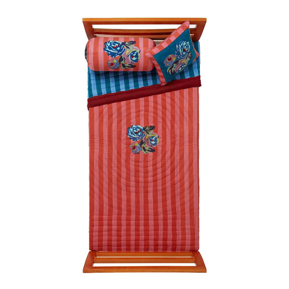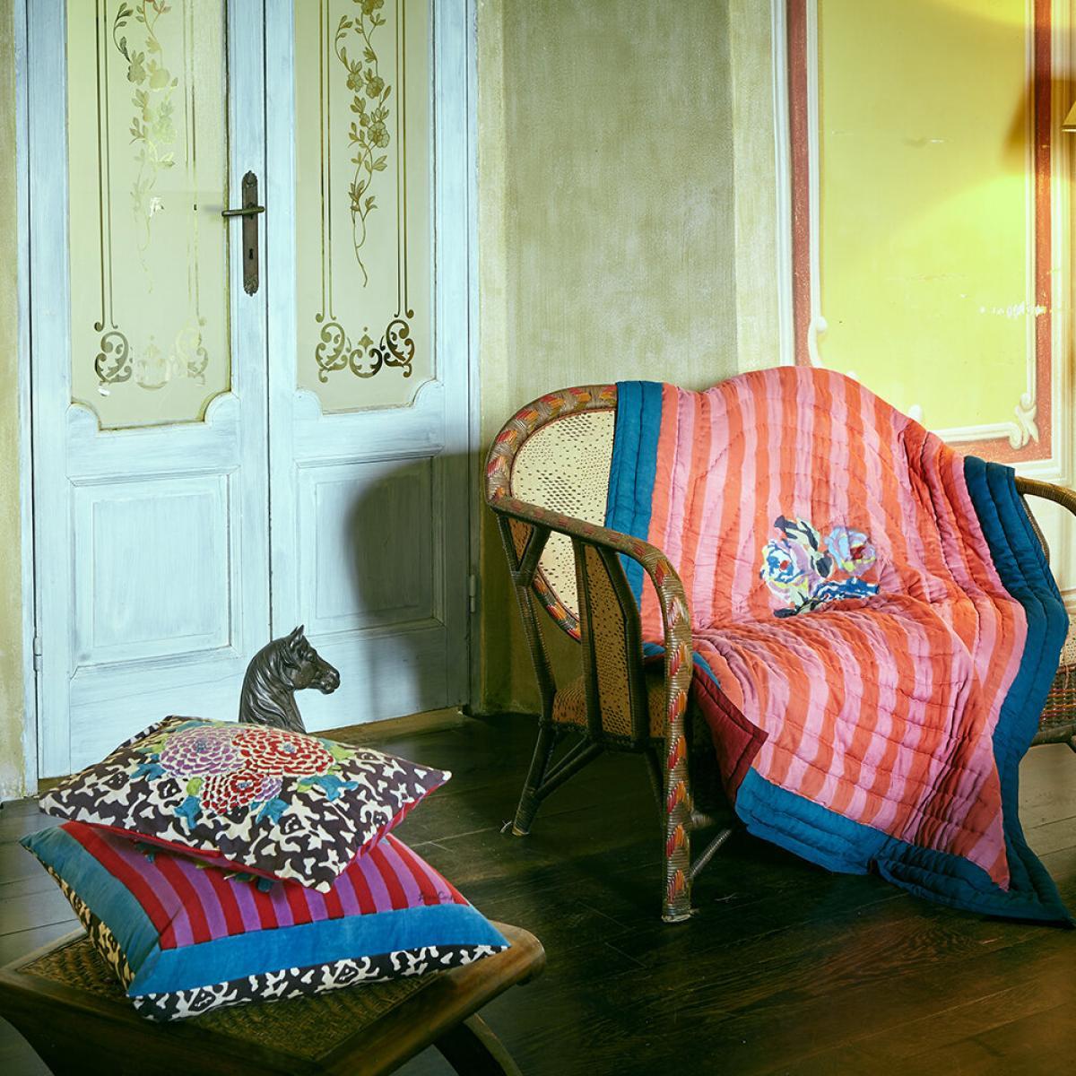 Add a charming finishing touch to your sleeping space with this Nizam bedspread from Lisa Corti. Made in India from cotton, it features a beautiful floral design on a contrasting striped background in red, pink, and blue tones. Pair with the Nizam cushions to complete the look.