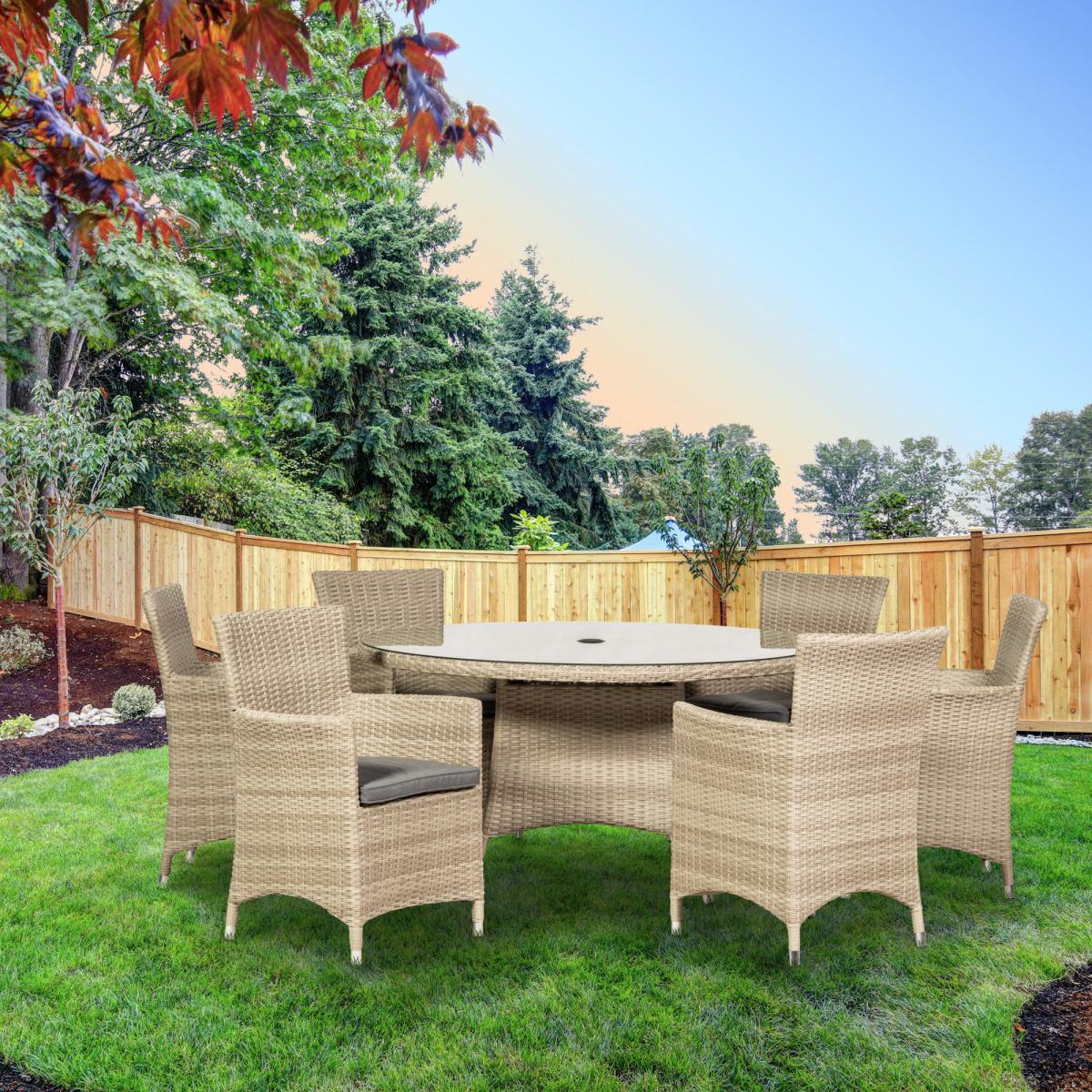 The Lisbon 6 Seater Round Dining Set is a practical and stylish choice for outdoor dining areas, especially if you favour a neutral, contemporary look. Its cream finish makes it versatile enough to blend with a variety of garden styles, from modern minimalist spaces to more traditional settings. I love how its round table encourages socialising and creates an intimate feel, perfect for family gatherings or alfresco dinners. For styling tips, consider adding colourful outdoor cushions or a patterned tablecloth to inject personality. To keep it looking fresh, pairing it with lush greenery or string lights can enhance its appeal, while a cover or storage during harsh weather will prolong its lifespan. This set is an excellent investment for creating a welcoming outdoor dining spot that works well in both small and spacious gardens.