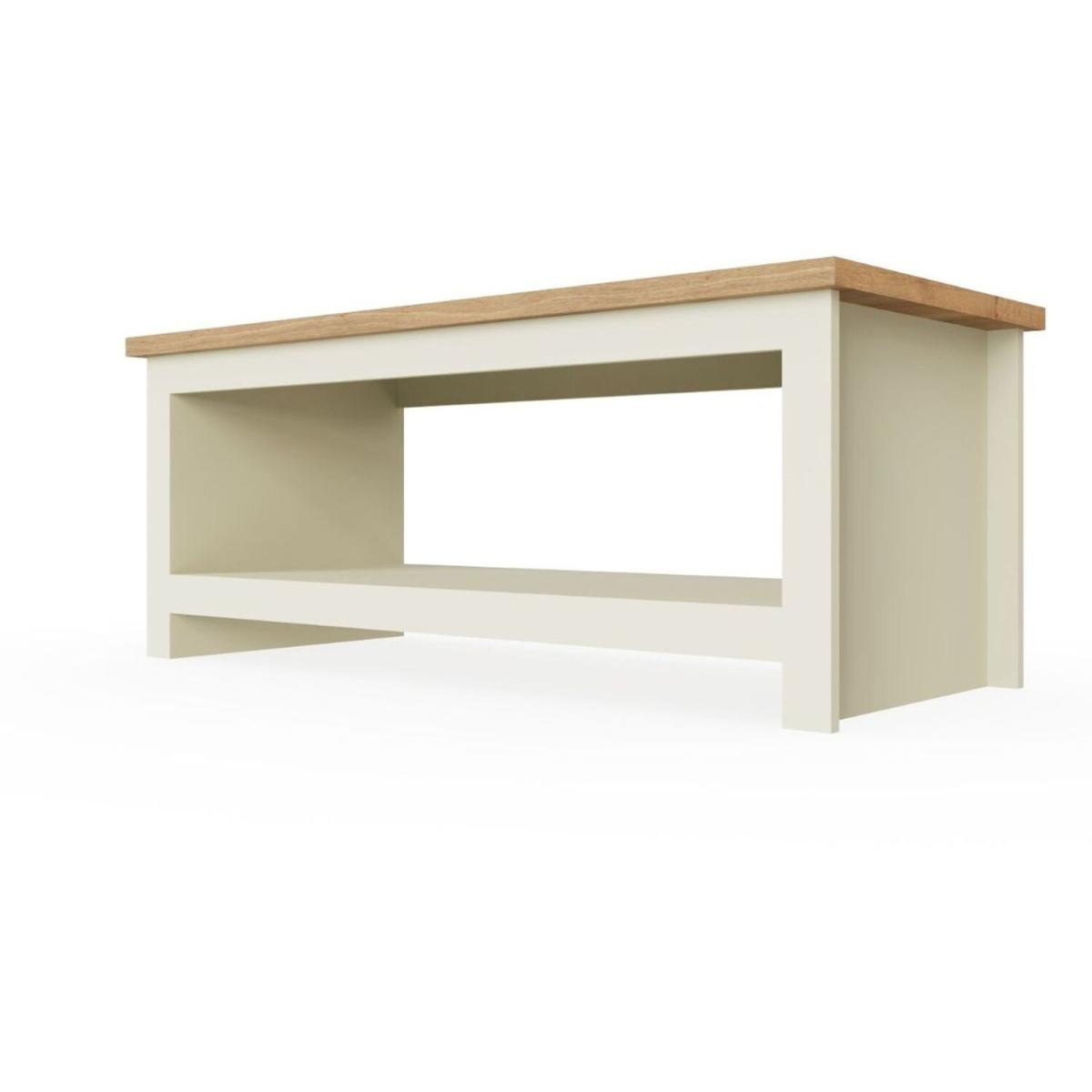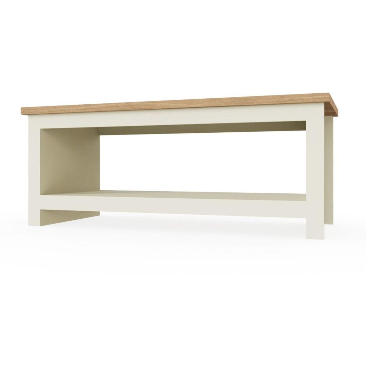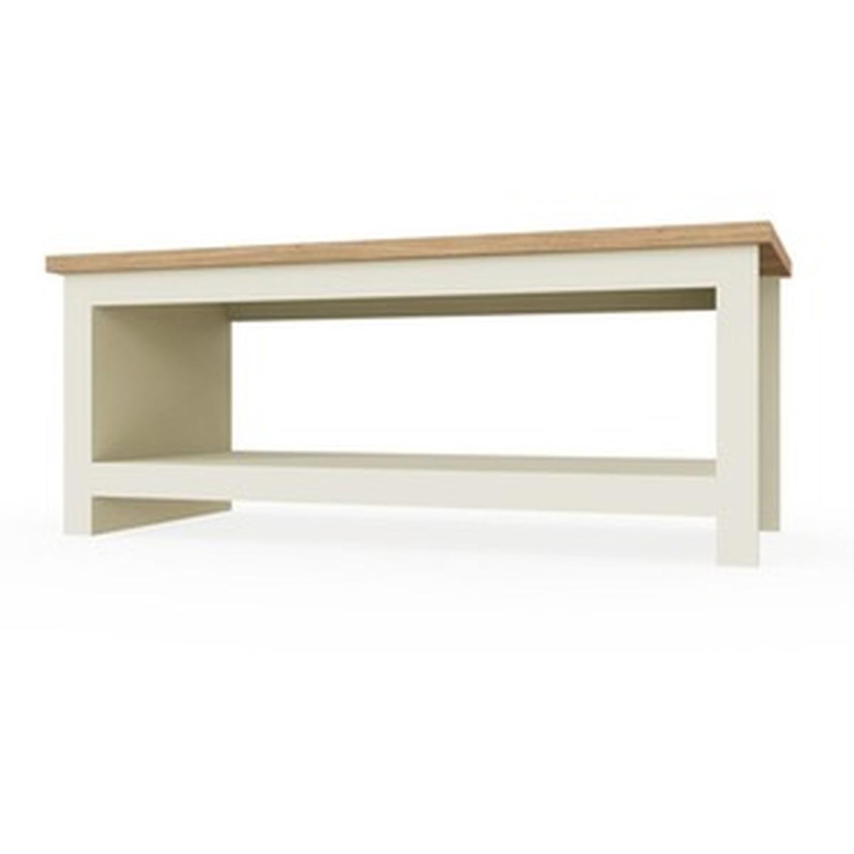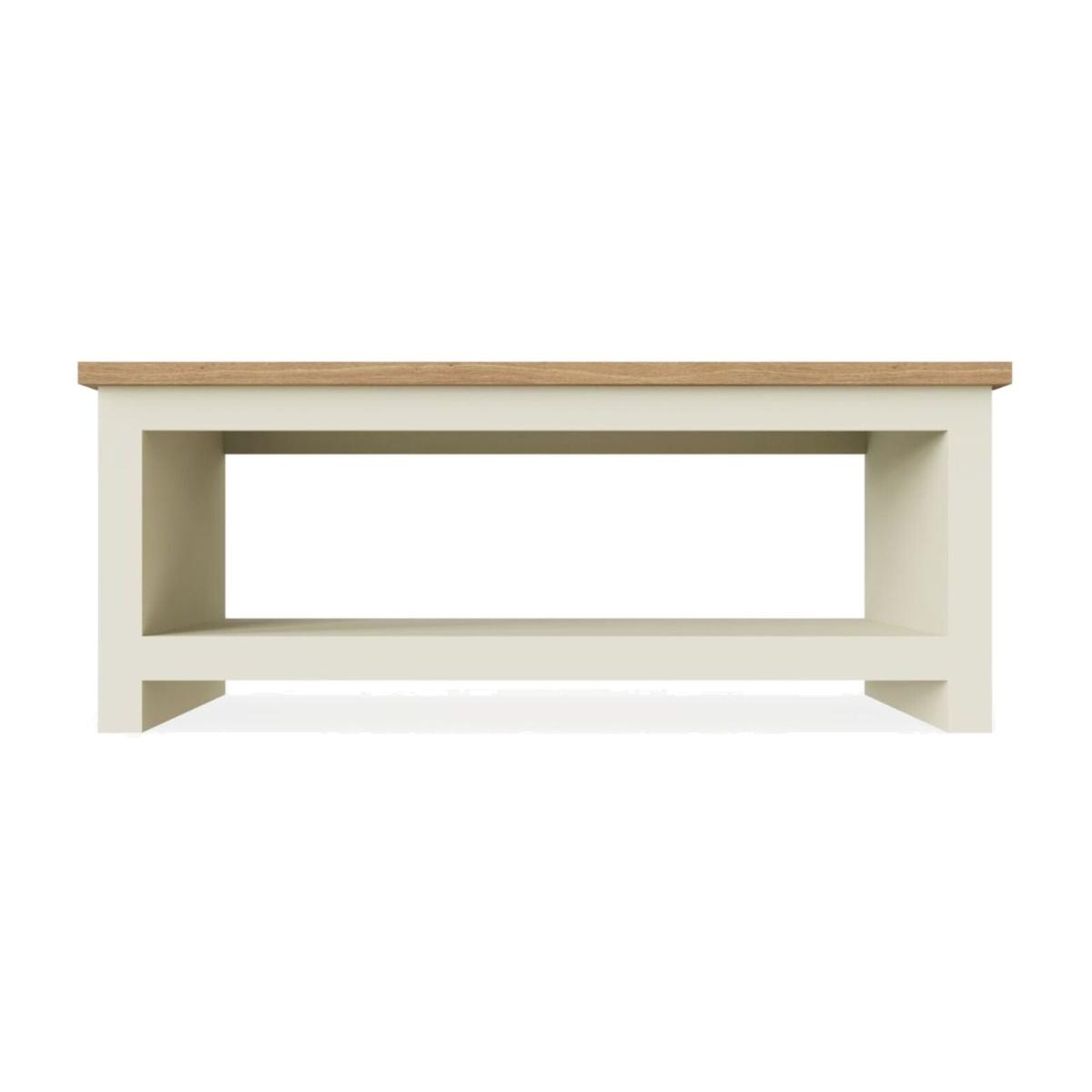 Full of presence, The Lisbon Range in Cream and cascading Oak tops fills any room with warmth and comfort. This charming coffee table will add style to any living room. Complete with a lower shelf for additional storage it will provide a lot of storage space for magazines, books, or remotes.