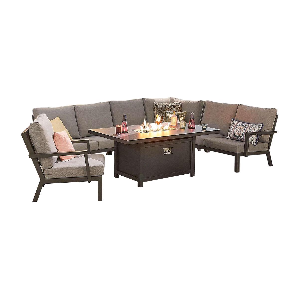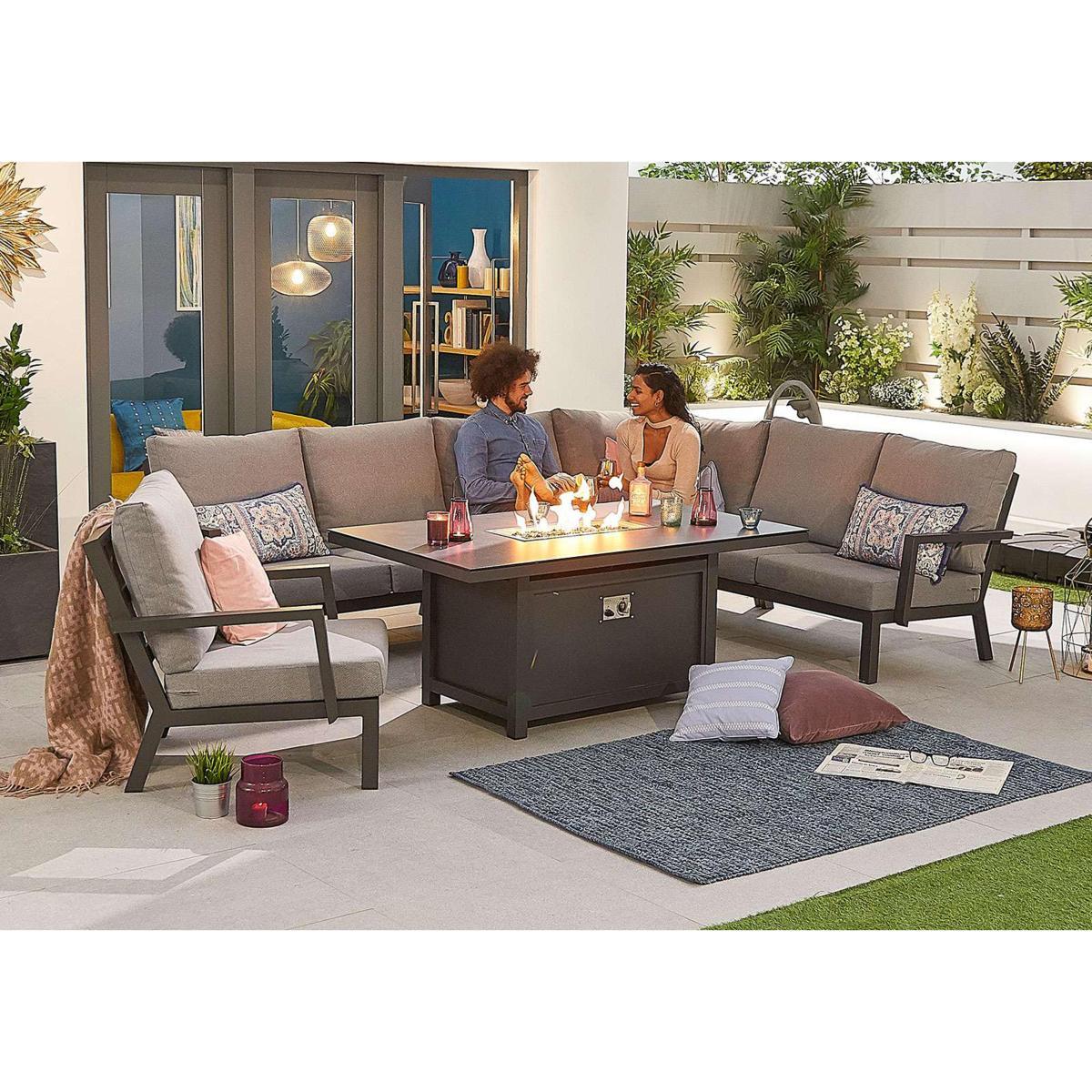 I love this corner dining set for its blend of practicality and style. Its contemporary design works well in modern garden spaces, especially those that aim for a relaxed yet sophisticated vibe. The fire pit table adds a cosy centrepiece that’s perfect for cooler evenings, making it versatile for both casual family get-togethers and more intimate gatherings. When styling, consider pairing it with cushions in neutral or muted tones to complement the grey upholstery, and add a splash of colour through accessories like outdoor lanterns or planters. The clean lines and restrained colour palette mean it works equally well in contemporary gardens, patios, or even a courtyard setting, providing a stylish focal point that invites outdoor living.