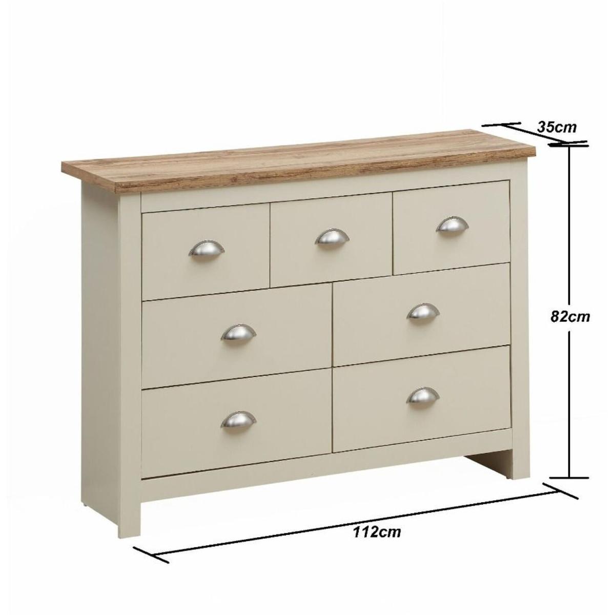 I’m a fan of this cream seven-drawer chest for its clean lines and soft, neutral finish - the oak-effect top adds just the right amount of warmth. It works equally well in a modern farmhouse bedroom, a coastal hallway or a pared-back Scandinavian living space. For styling, keep the surface clutter-free with a simple round mirror and a pair of ceramic vases or a low-profile lamp. Use woven baskets inside the larger drawers to separate linens or seasonal accessories, and anchor the piece with a textured rug and muted artwork to let its soft tones shine through.