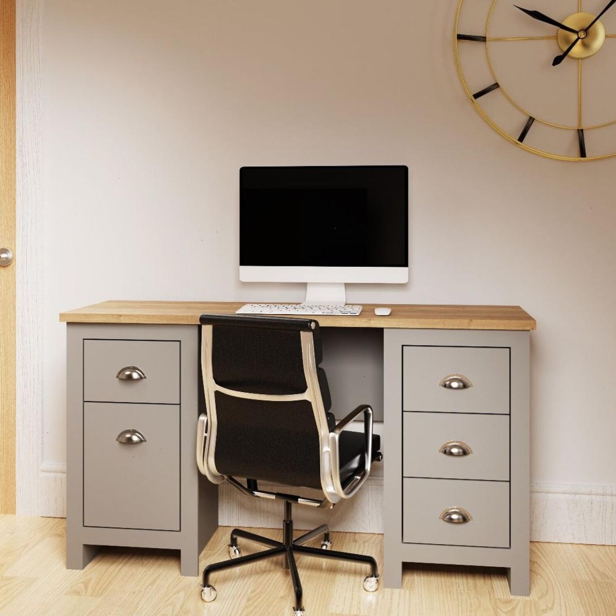I’m a fan of the Lisbon desk for its clean lines and practical storage - the soft grey finish pairs effortlessly with both Scandi and modern-farmhouse schemes. The double-pedestal design means you’ve got six drawers to hide away paperwork or tech clutter, leaving the oak-effect top clear for your laptop and a statement lamp. To style, tuck a slim desk organiser in one corner and a small potted plant in the other for a fresh pop of green. Choose a simple metal or leather-upholstered swivel chair to keep the look uncluttered, and add a gallery-style clock or floating shelves above to frame your workspace without overwhelming it.