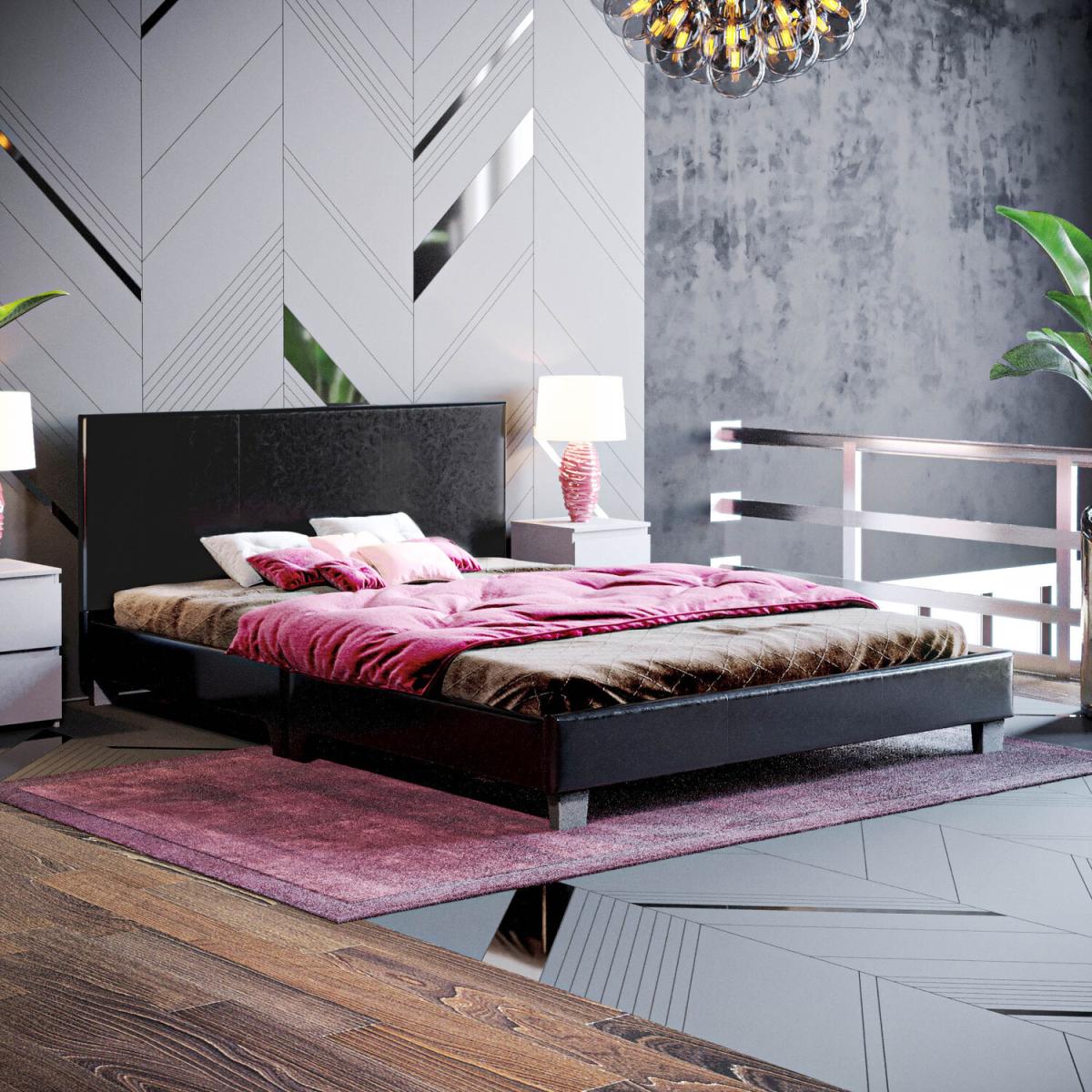 I love how the black faux leather bed brings a clean, contemporary feel without looking too heavy; its low profile and slim headboard suit modern, industrial or Scandi-inspired bedrooms alike. The vinyl upholstery is hard-wearing and easy to wipe down, so it works particularly well for busy households or rentals. For styling, layer neutral linens with a chunky knit throw and a couple of velvet cushions to add depth. A light-wood or matte-metal bedside table on each side keeps things balanced, while a simple rug underfoot and a slimline floor lamp will soften the overall look without detracting from the bed’s streamlined silhouette.