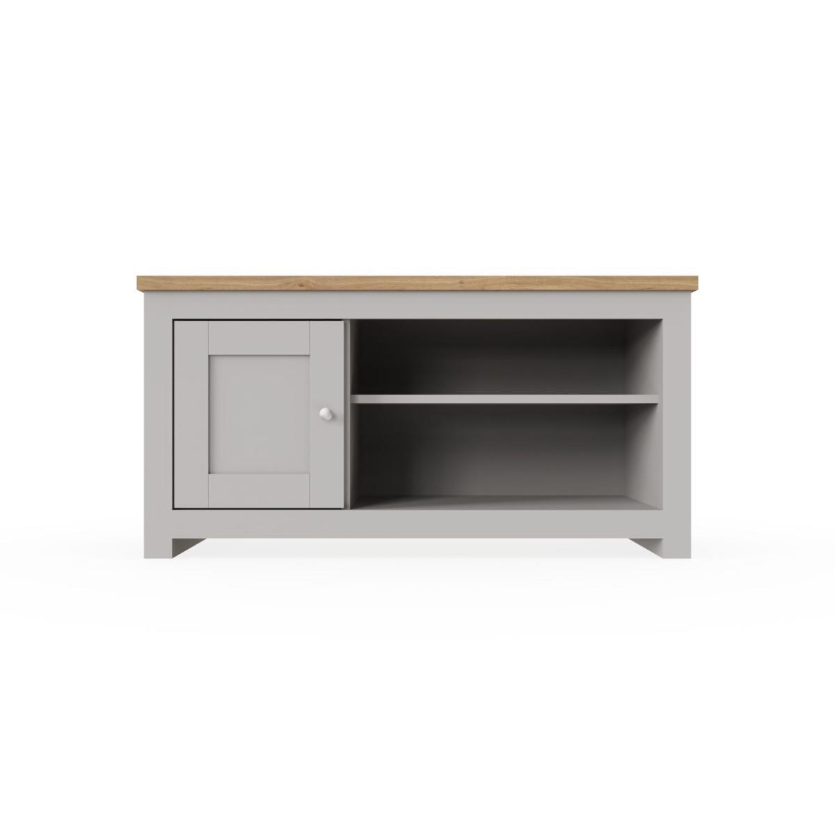 Full of presence, the Lisbon range in Grey and cascading Oak tops fills any room with warmth and comfort. The Lisbon TV unit features an open shelf that will hold all your media devices and a large cupboard. Made in a modern Grey with a contrasting top will be a great addition to any interior and it will add style to your living room.