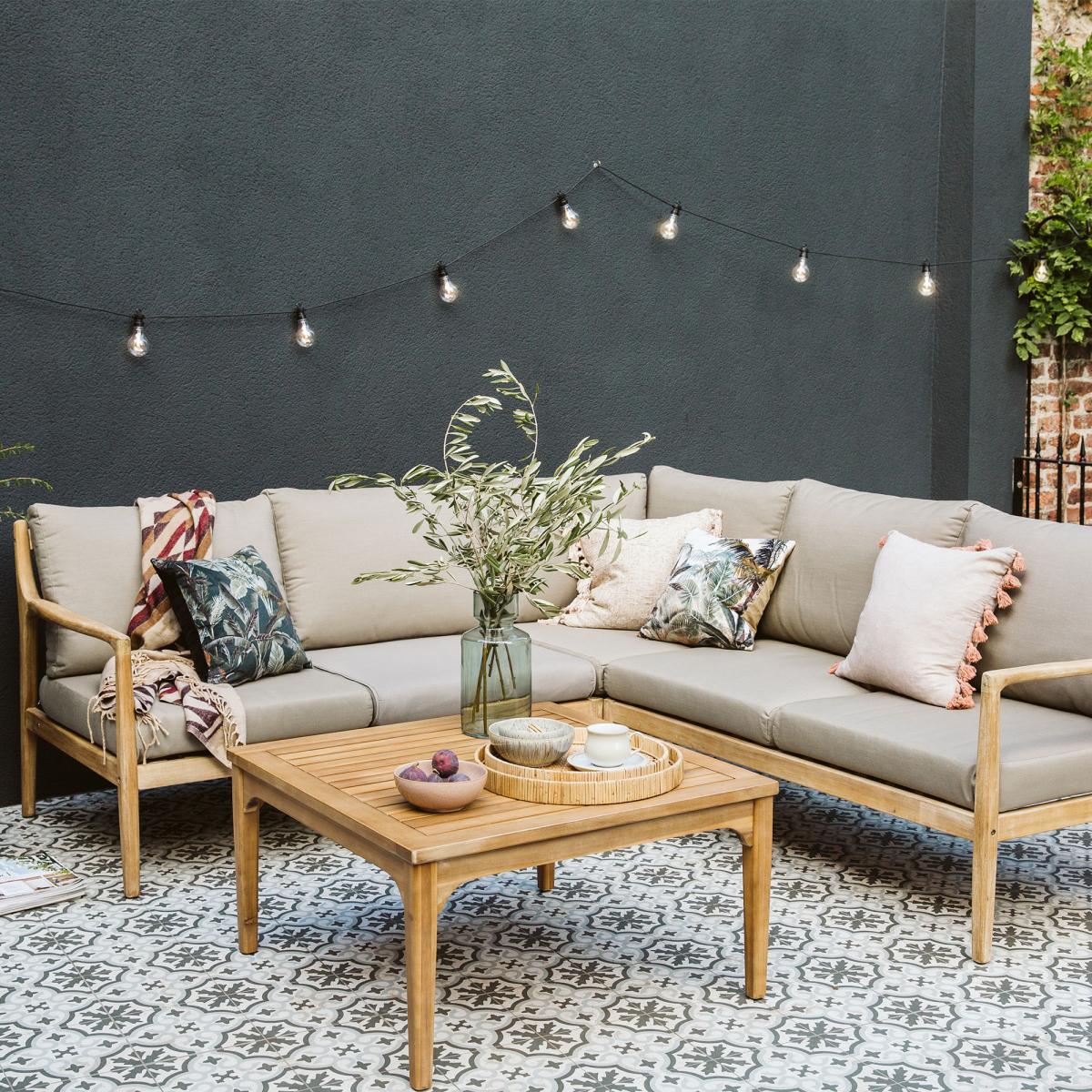 With stylish taupe cushions sat upon a light Acacia wood frame, the Lisbon garden lounge corner set creates the perfect spot for an afternoon of soaking up the sun. The comfy garden corner sofa is accompanied by a matching coffee table, also in Acacia wood, instilling a more natural vibe to your outdoor setting.