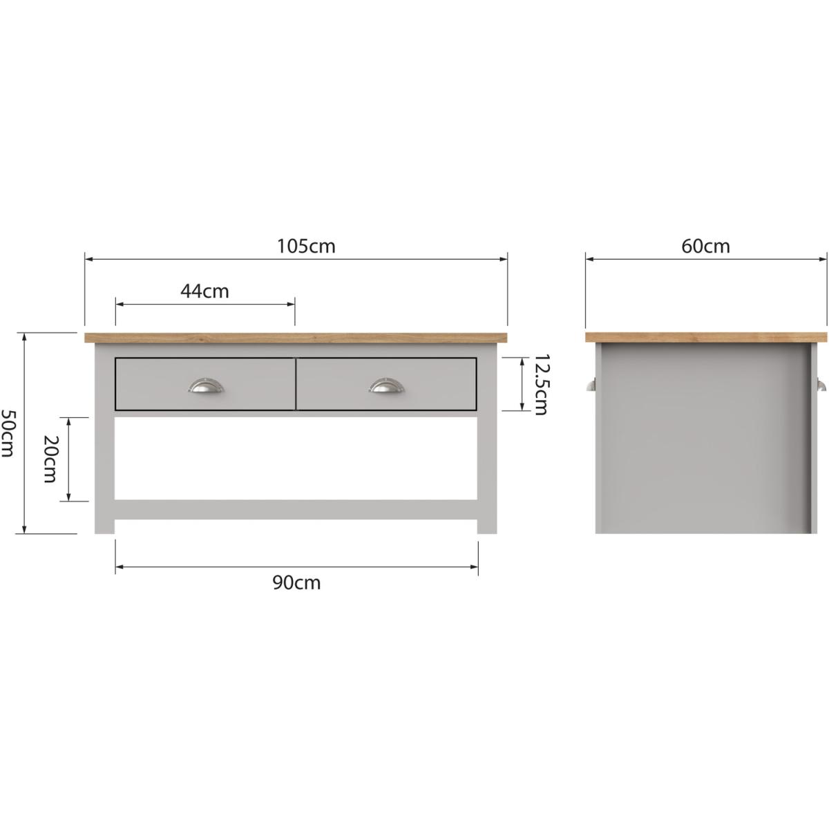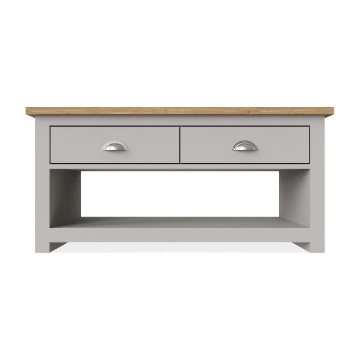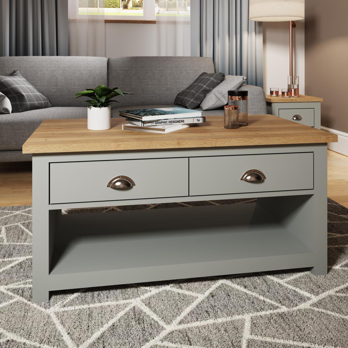 Full of presence, the Lisbon range in Grey and cascading Oak tops fills any room with warmth and comfort. This charming coffee table will add style to any living room with two drawers which open from both sides of the table. Complete with a lower shelf for additional storage it will provide a lot of storage space for magazines, books or remotes.