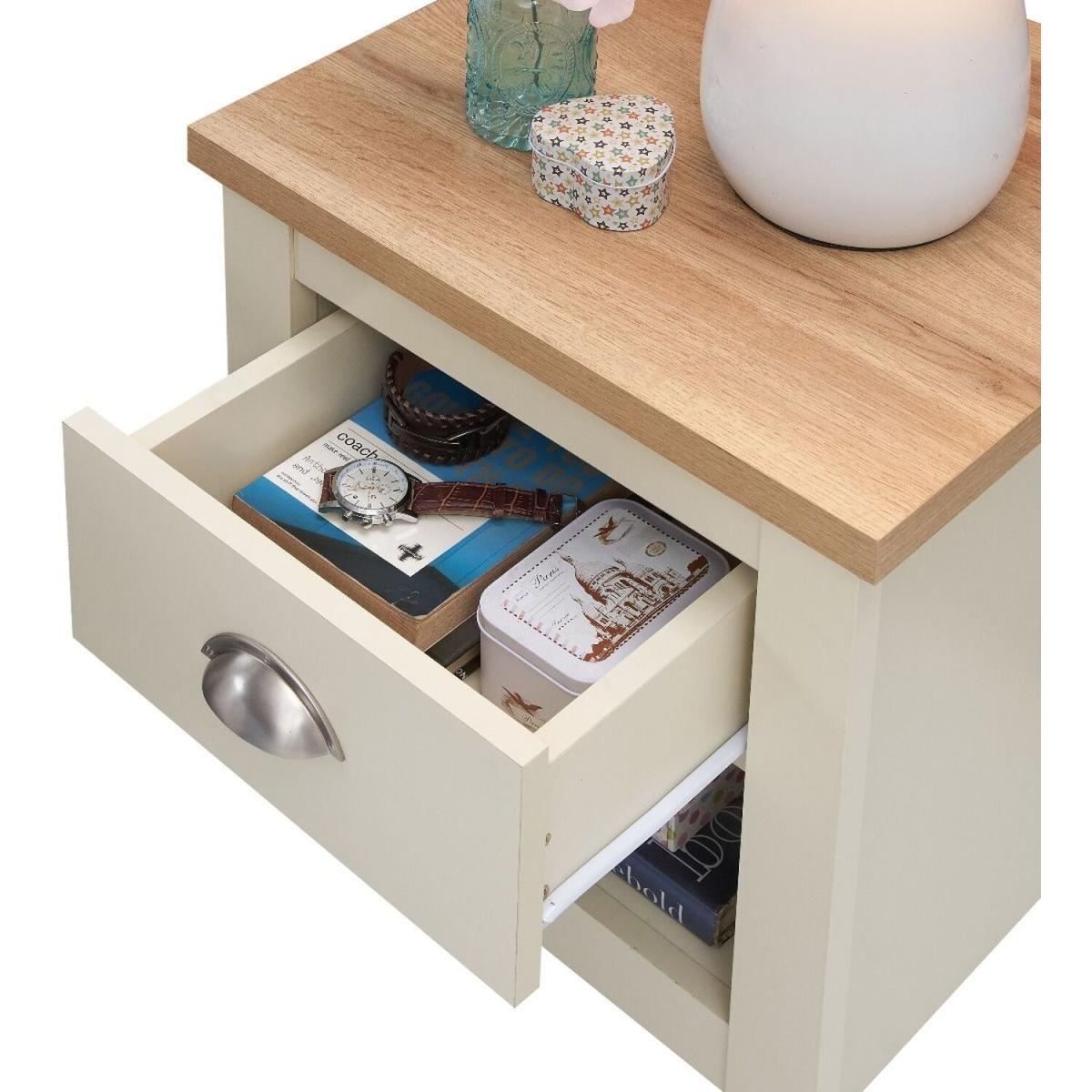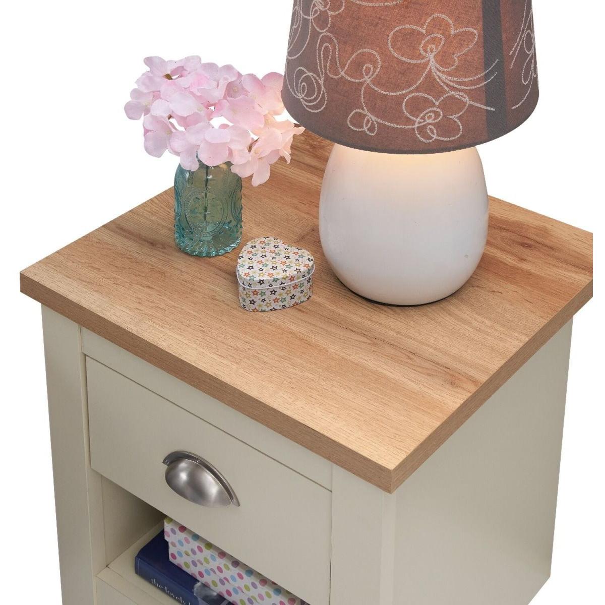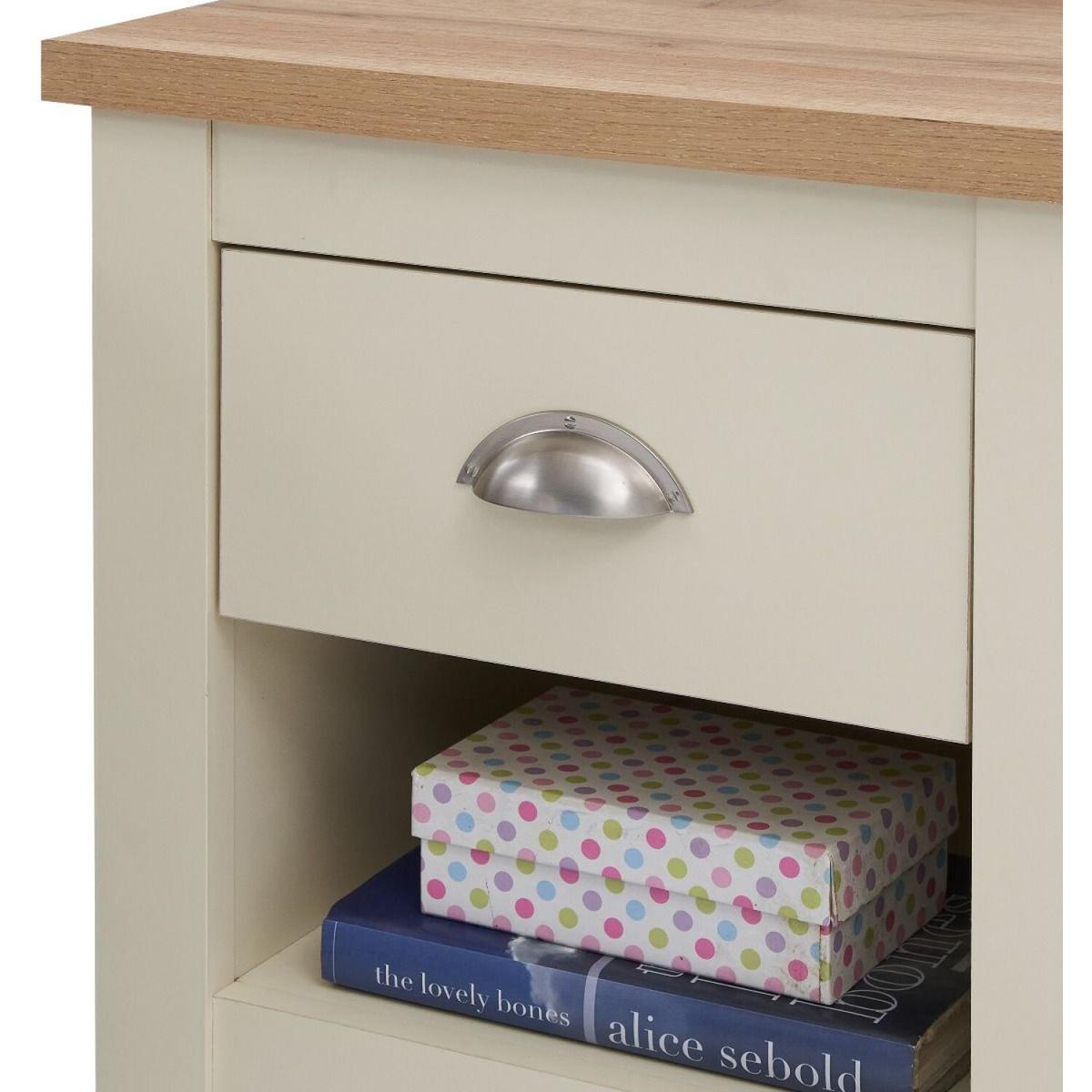 Full of presence, the Lisbon range in Cream and cascading Oak tops fills any room with warmth and comfort. This beautiful 1 drawer table is extremely versatile and can be used both as a bedside table in any bedroom as well as lamp table in the living room.
