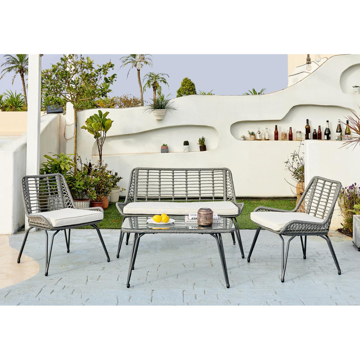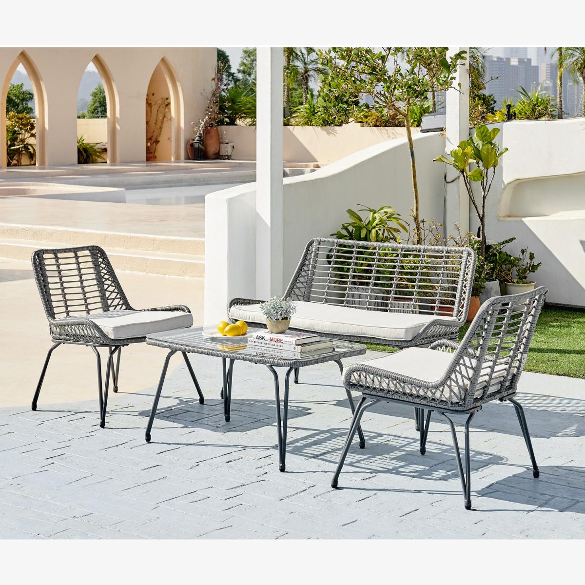 Our laid back Lisbon Outdoor 4-seat wicker-effect rattan garden set with coffee table will add some boho industrial vibes to your outdoor living space. Featuring a 2-seater sofa and 2 chairs, with matching glass-topped coffee table for some relaxed, informal garden seating. The Lisbon is a more rustic style garden set with modern industrial touches through the tapered metal legs that will look great in all gardens, conservatories and patio spaces. The PE rattan is stylishly woven over sturdy but lightweight steel frame and the thick padded cushions complement the frame well. The cushions are 5cm thick for comfort and are splash-proof. The glass coffee table top is 5mm thick tempered glass. Perfect for lounging around enjoying outside dining with friends or family or for creating a lovely zen calming space in nature. The PE rattan and the cushions are all UV resistant so shouldn't fade. The frames are weather resistant and the cushions are splash proof (so if any spills occur, pick up the cushion and give it a firm pat on the underside to encourage the droplets to roll off). However, the cushions should not be left outside or in damp conditions. Store them somewhere warm and dry. If they do get wet then allow them to fully dry in the sun or somewhere warm before you store them. This set includes a FREE water resistant cover but please note, this is not fully waterproof and you should still store your cushions somewhere dry during wet weather and through winter. We're excited to bring you our new outdoor range developed in-house by our product design team! We've overseen the process, from creating initial designs to hand-selecting the colours and fabrics. So, you can rest assured that you'll receive a Furniturebox design that won't compromise on style or comfort and won't break the bank!