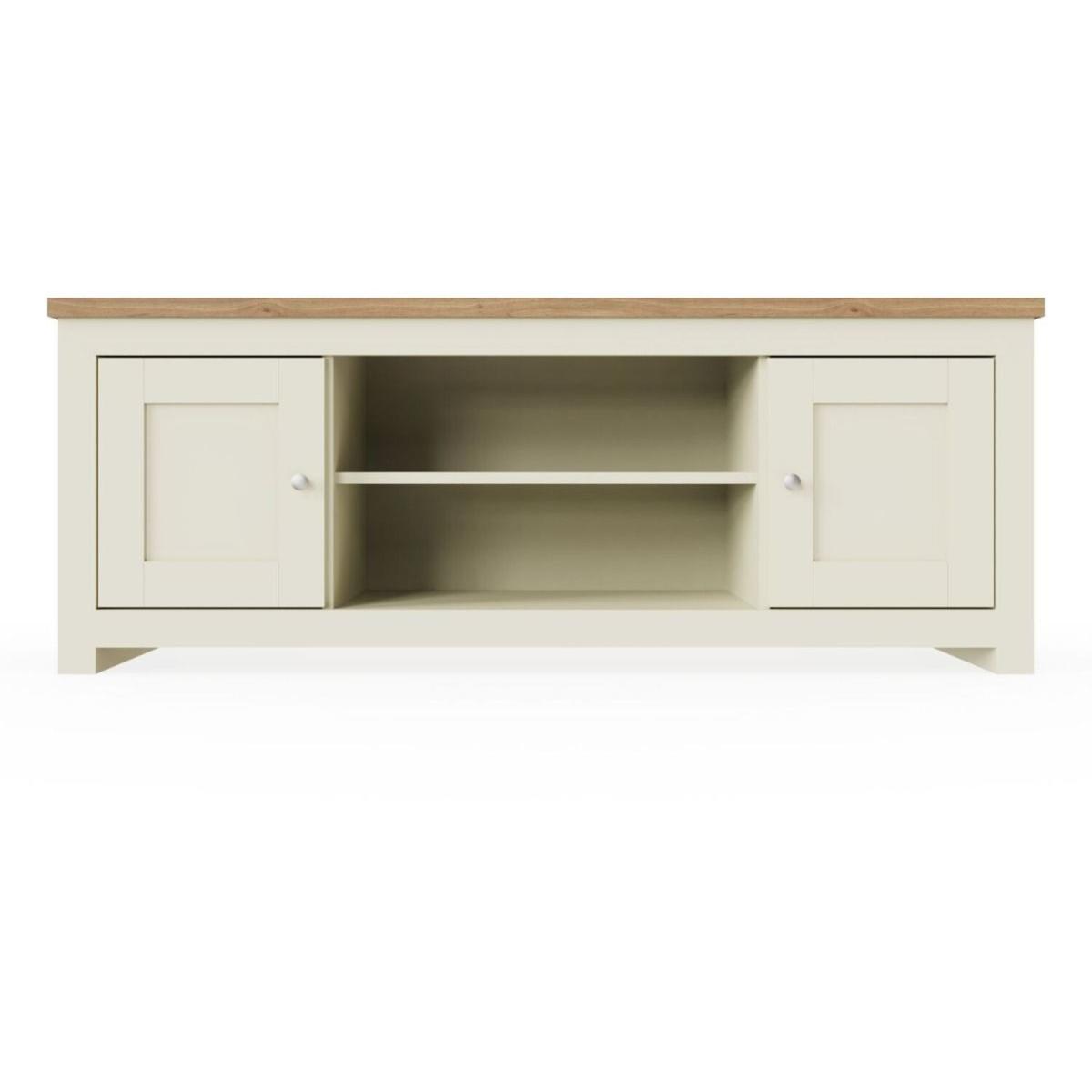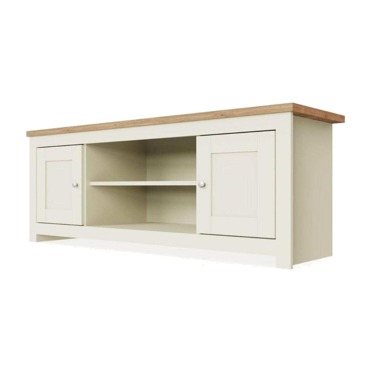 Full of presence, the Lisbon range in Cream and cascading Oak tops fills any room with warmth and comfort. The Lisbon TV unit features an open shelf that will hold all your media devices and two large cupboards.