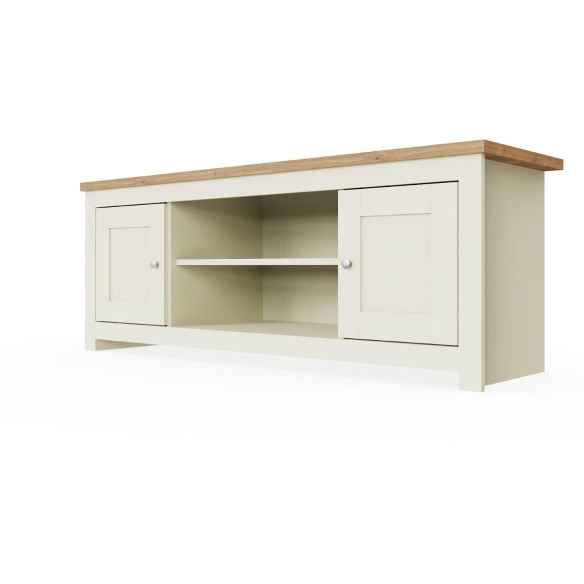 I really like this TV unit for its clean, classic design and versatile colour. It works well in both traditional and contemporary interiors, especially those embracing a light, airy aesthetic. Its neutral cream finish adds warmth without overpowering the space, and the wooden top adds a touch of rustic charm. Practical styling tips include using the open shelf for media devices or decorative books, while the closed doors can conceal clutter, keeping the look tidy. Pair it with cosy textiles and natural materials for a relaxed vibe, or add metallic accents for a more modern edge. Overall, this piece is a stylish yet functional addition that can adapt to a variety of living room styles.