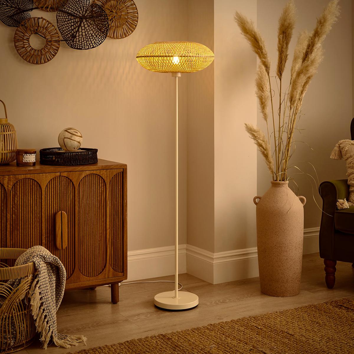 * Unique, Charming Design* Handmade with Care* Emits Decorative Light* Crafted from FSC Bamboo Illuminate your living space with the natural charm of the Lise Bamboo Uplighter Lamp. Handmade with care, it boasts a unique design crafted from bamboo, complemented by a cream iron base. Emitting a decorative light, this lamp adds warmth and character to your living room or hallway, creating a welcoming ambience.