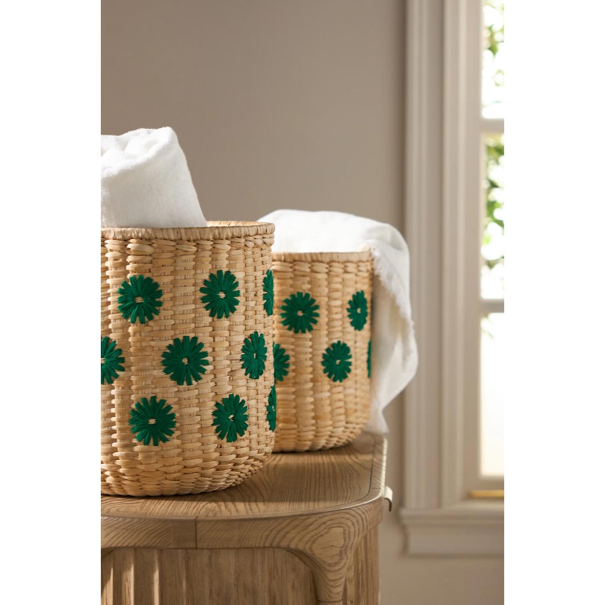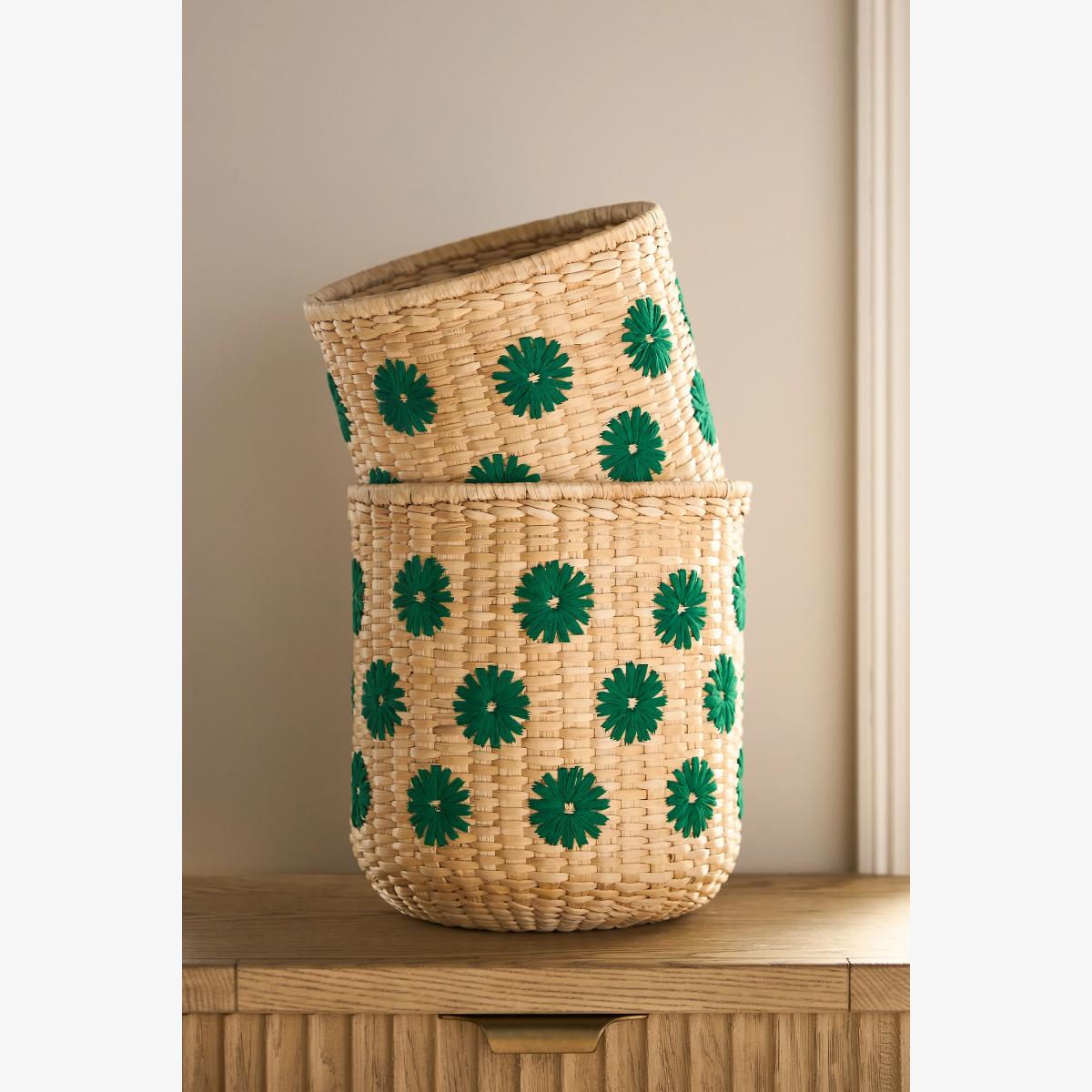 I’ve been using these Lita woven baskets for both function and flair - the banana‐bark weave feels natural and holds its shape, while the simple floral embroidery in green adds a fresh pop without overpowering a room. They work equally well in a countryside kitchen for storing root veg, a Scandi-inspired living room as a throw-blanket basket, or even a coastal hallway for umbrellas and scarves. My top tip is to mix sizes: leave the larger one on the floor beside a sofa or desk and pop a tall plant or rolled rugs inside, then use the smaller on a shelf or console to corral mail and keys. Keeping them in open view makes the most of their texture, so avoid over-cluttering around them and let that subtle pattern do the work.