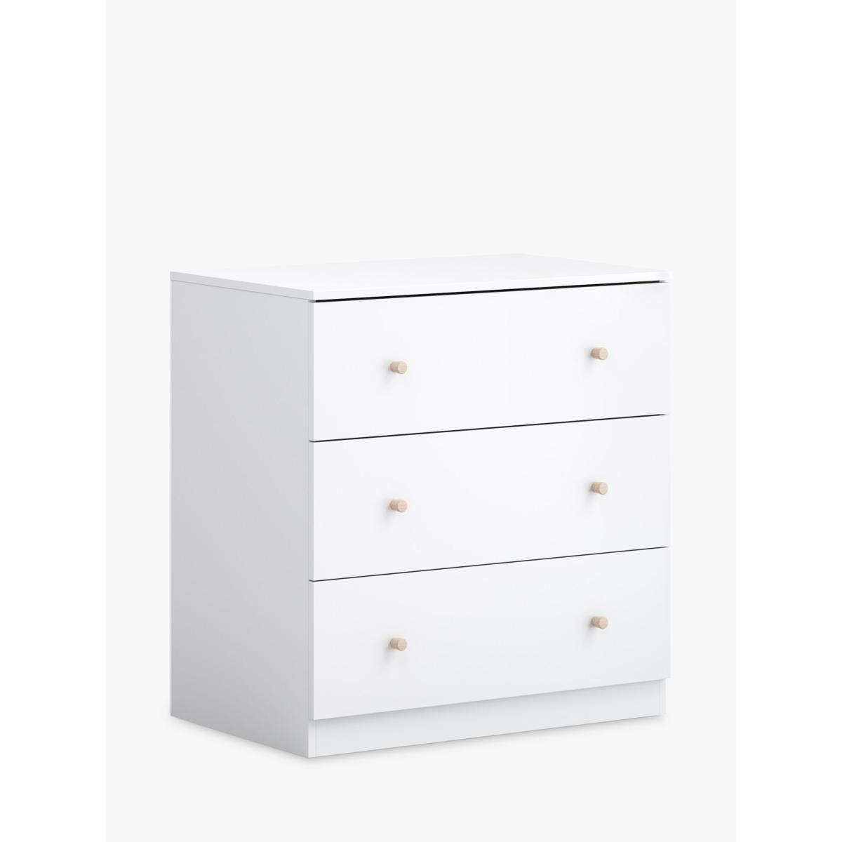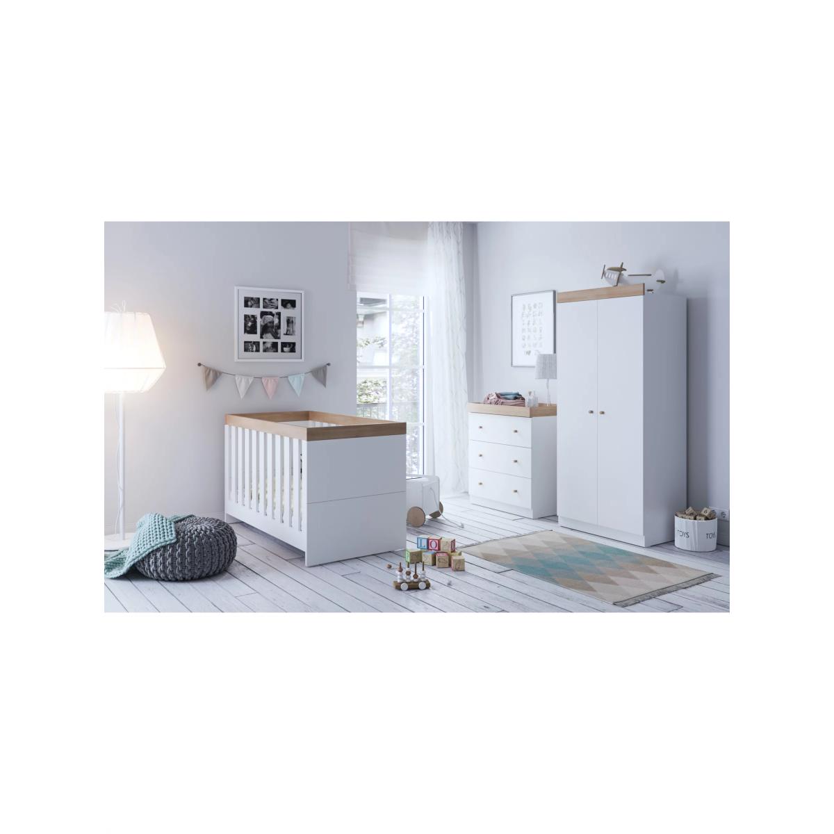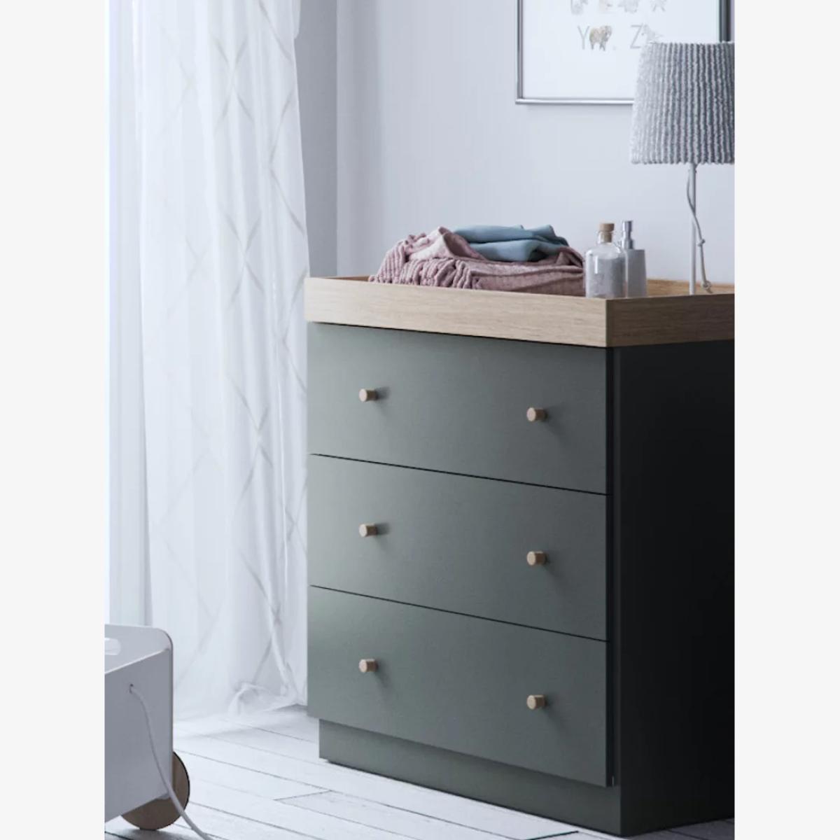 I love this little acorns dresser for its clean, Scandinavian-inspired design that works well in both modern and traditional nurseries. Its soft muted tones and simple lines provide a calm, understated look, making it versatile enough to fit into various colour schemes. Practical styling tips include pairing it with neutral or pastel accents, such as soft textiles or artwork, to create a serene space. The enclosed drawers offer ample storage for changing essentials, helping to keep the nursery organised. To keep it looking fresh, consider adding a cosy changing pad on top and incorporating elements like textured baskets or decorative knobs for a personalised touch.