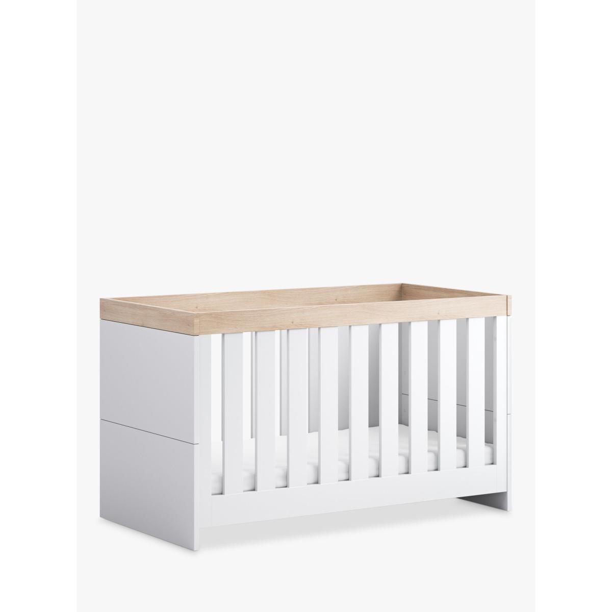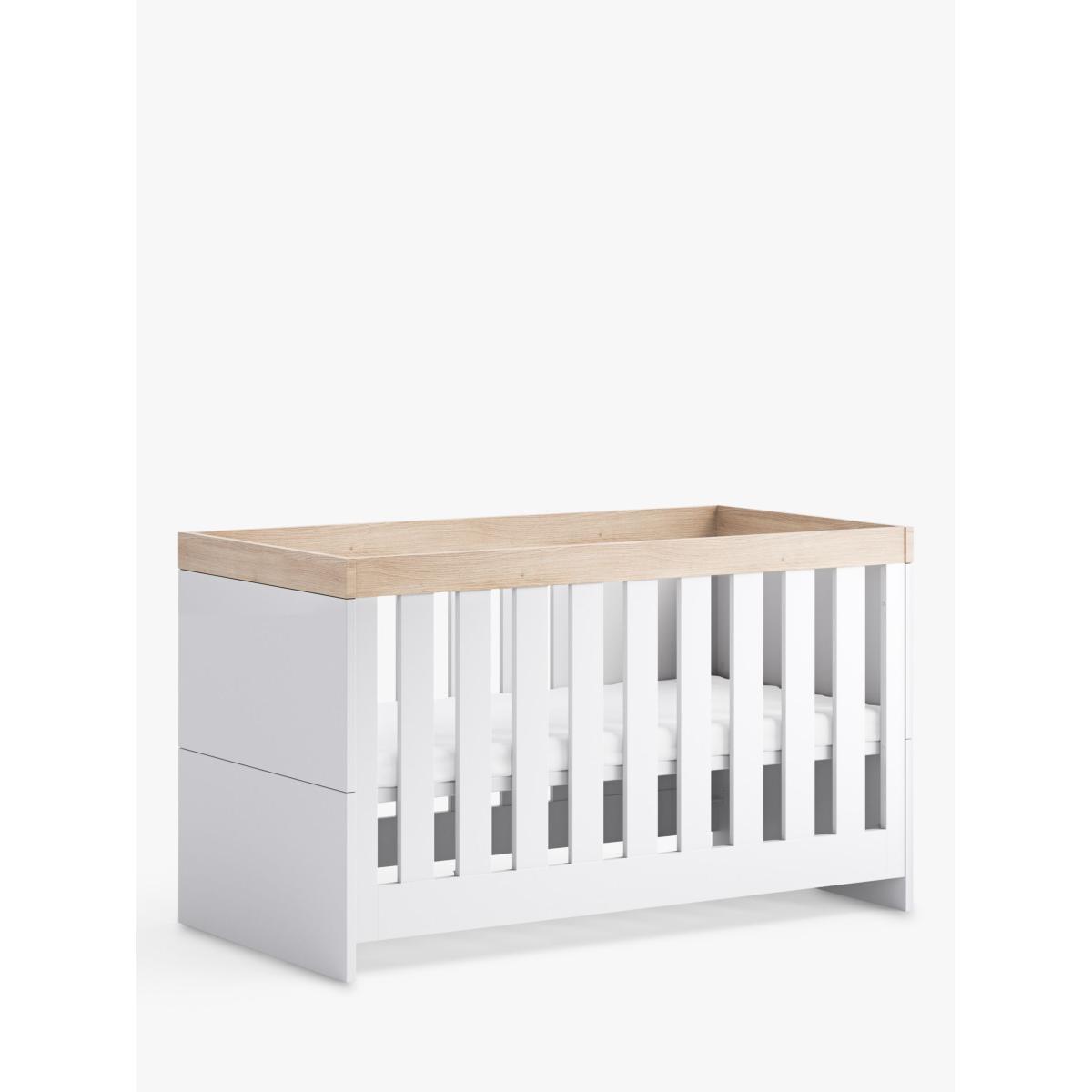The Burlington range from Little Acorns features stylish and modern Scandinavian-inspired designs with attractive oak accents. This cotbed is designed for your child (and you) to enjoy a good night's rest. A substantial construction, it fits in any modern or traditional nursery, with its two-tone solid ends and chunky wide-slatted sides. The three-position base means it grows with the baby too. The cot bed is suitable from birth to around four years. So once your child is old enough to go into a proper bed, the cot can be adapted into a toddler bed by removing the side rails, splitting the head and footboard. To complete your nursery set, the matching Burlington Dresser and Wardrobe are also available for purchase separately. Key Features: Suitable from birth to approx. 4 years Converts to toddler bed Comes flat-packed in one box Adjustable to 3 mattress heights Mattress size required: 140 x 70cm (not included)