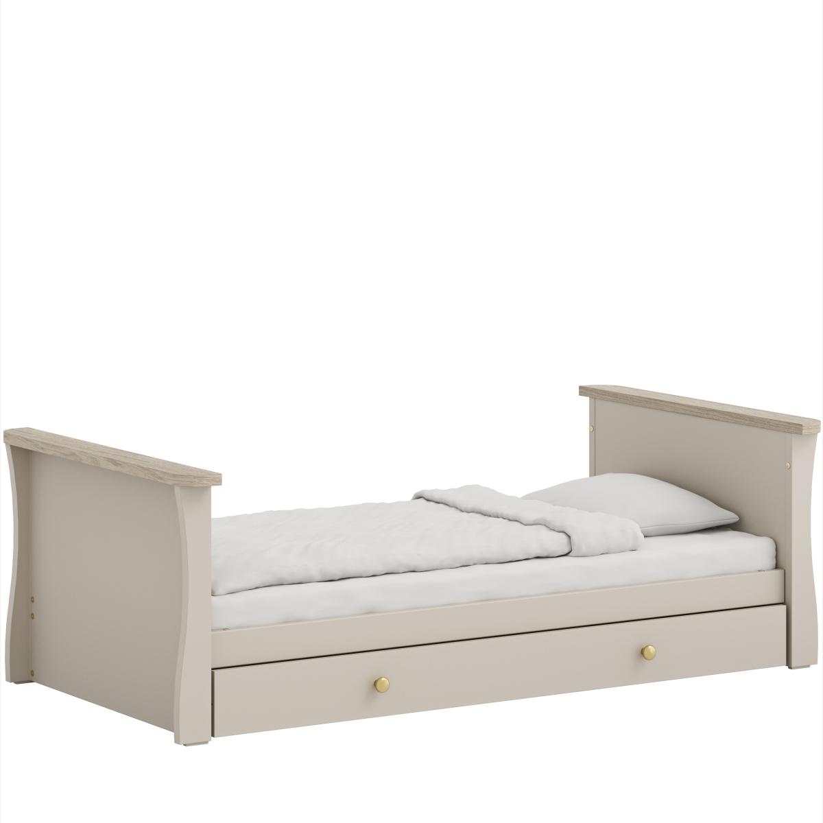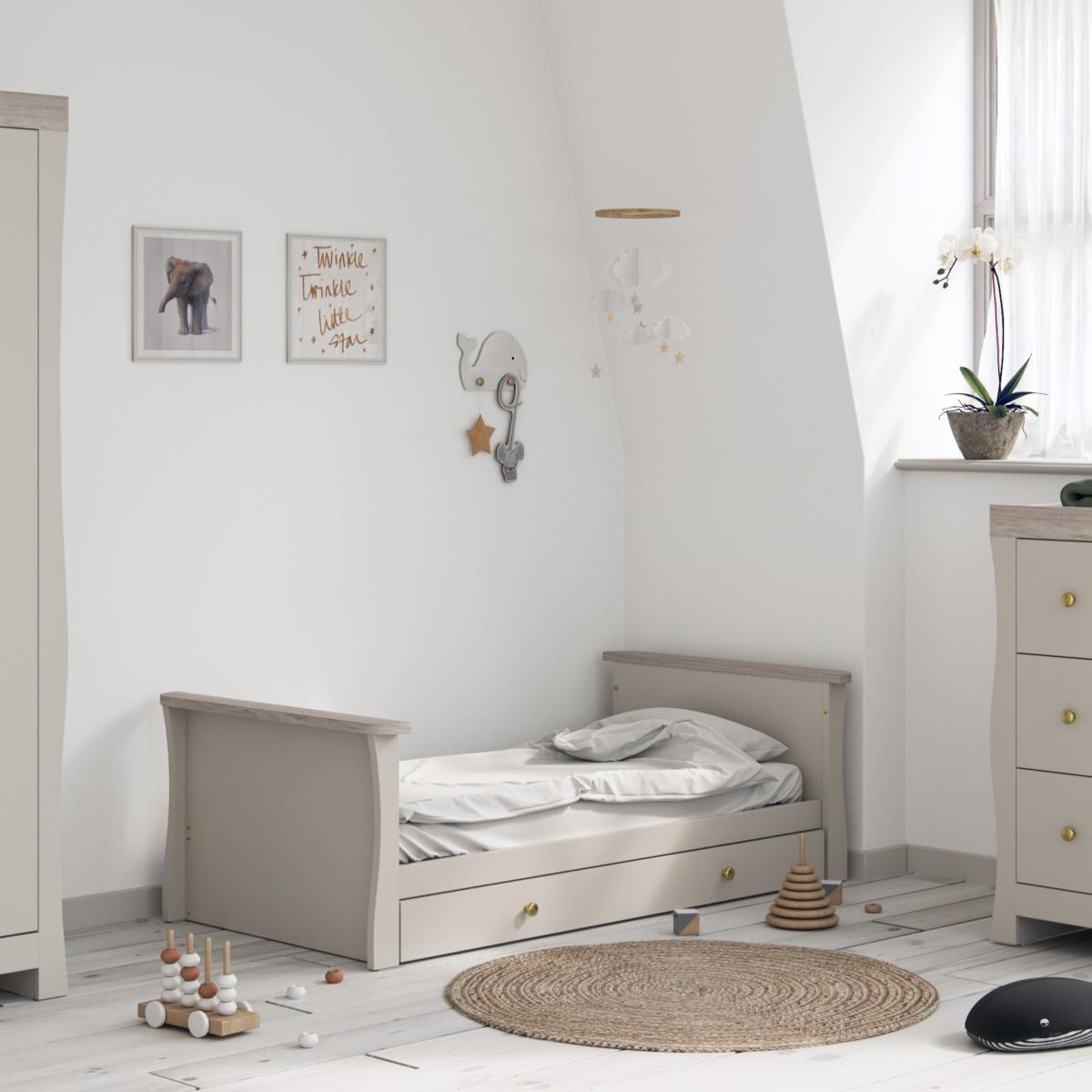 * Classic curved design in Cashmere & Grey Ash* 2 adjustable mattress heights* Converts to toddler bed* 3 large drawers with 40cm depth* Double wardrobe with 2 shelves and 2 hanging rails* Matching furniture available The Little Acorns Celeste 3 Piece Nursery Furniture Set in cashmere and grey ash boasts a classic curved design and clean finish. The cot bed features two mattress heights and converts to a toddler bed. The set includes a beautifully crafted dresser with three spacious drawers and a baby changing unit, and a double wardrobe offering flexible storage with two shelves and two hanging rails. Matching furniture items, including an underbed drawer, are available separately.