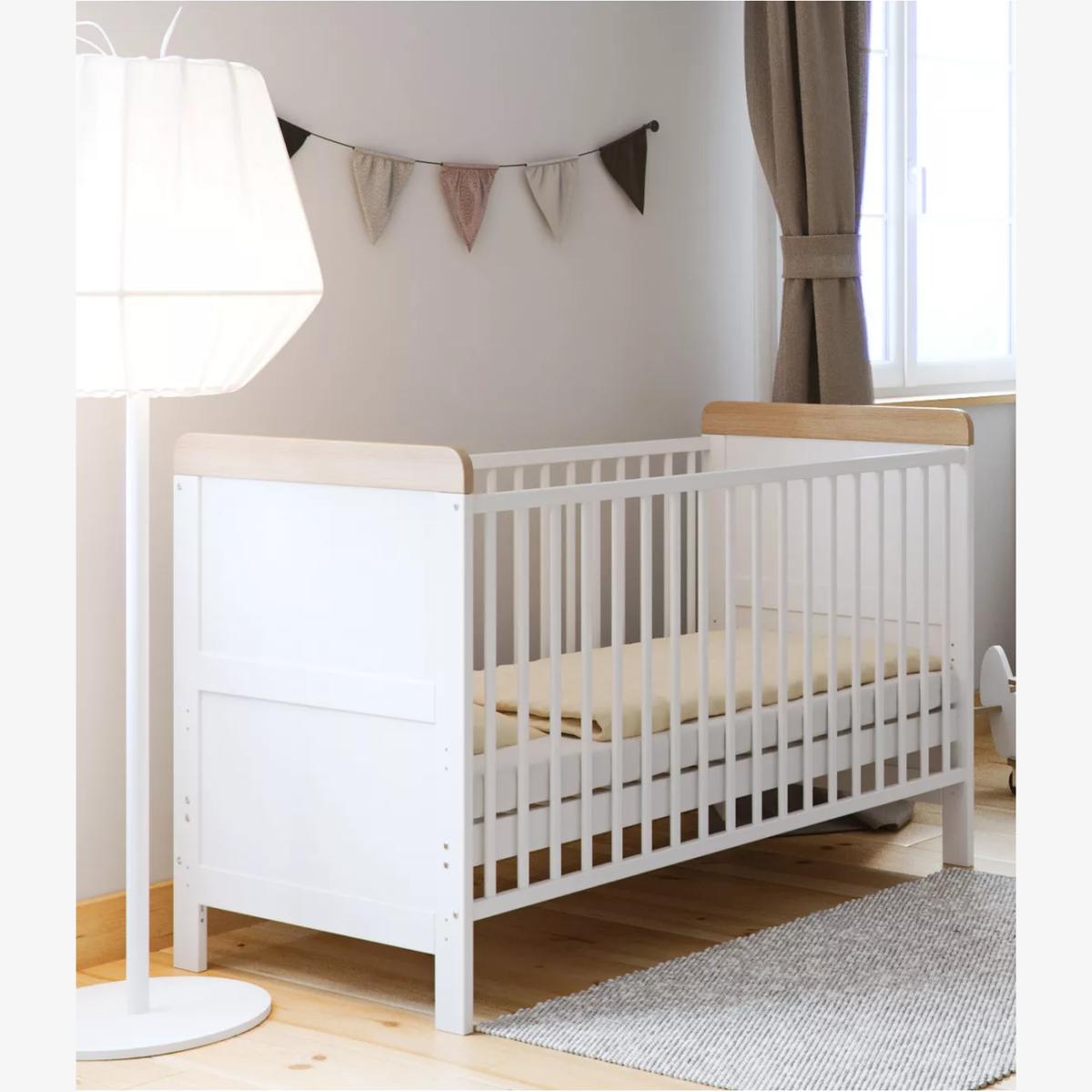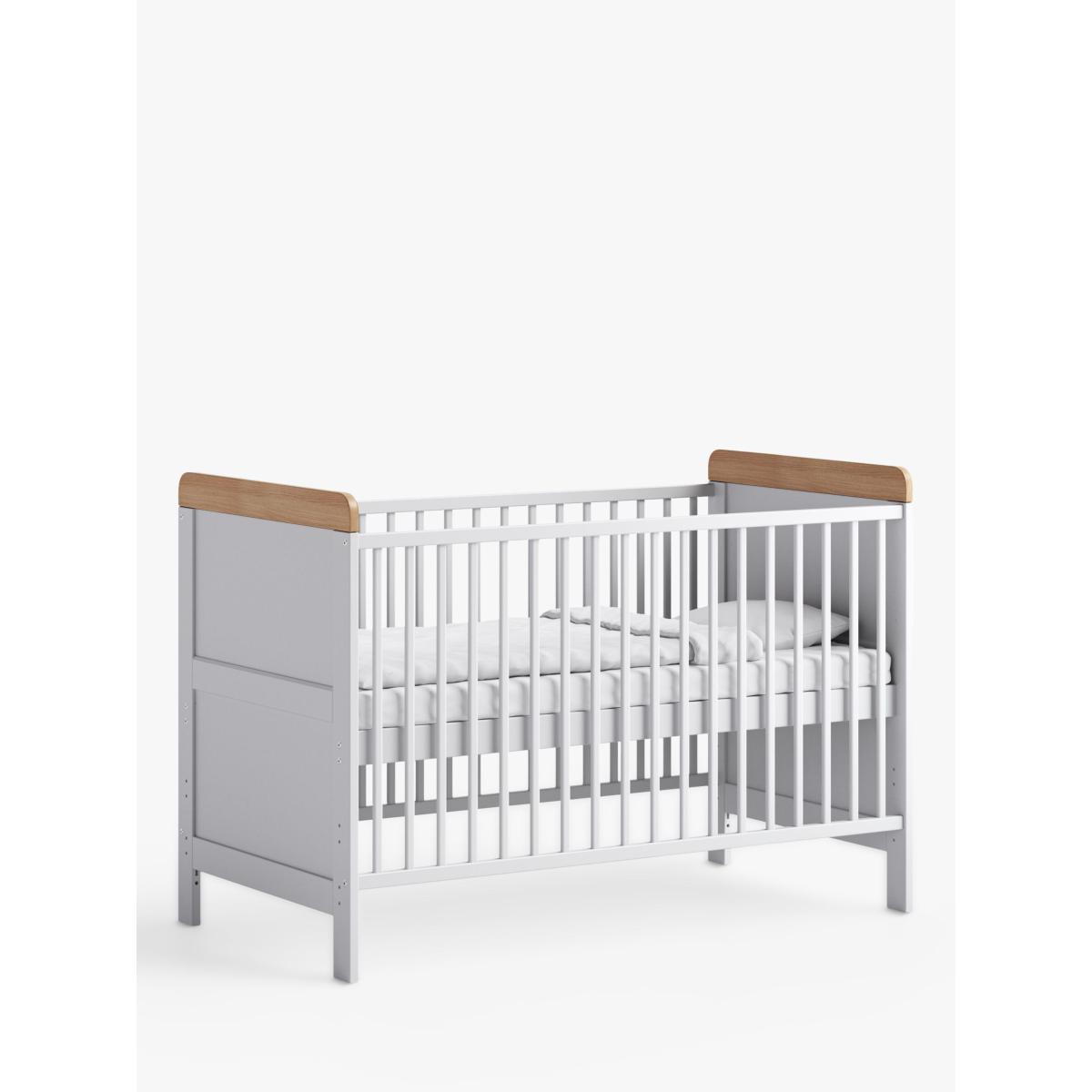 I really like the little acorns cotbed because of its classic design and two-tone finish, which makes it versatile for various interiors. The white combined with oak adds a touch of warmth and brightness, making it suitable for Scandi-inspired nurseries or contemporary spaces. When styling around it, opt for natural textures such as cotton, linen, or soft wool for bedding and accessories, which will complement the wood tones beautifully. To keep the look cohesive, consider muted pastel or neutral coloured linens and playful soft toys, ensuring the space remains calming and inviting. Practical tips include keeping the area clutter-free with storage baskets or under-bed drawers, and adding a plush rug nearby for comfort during those precious nursery moments.