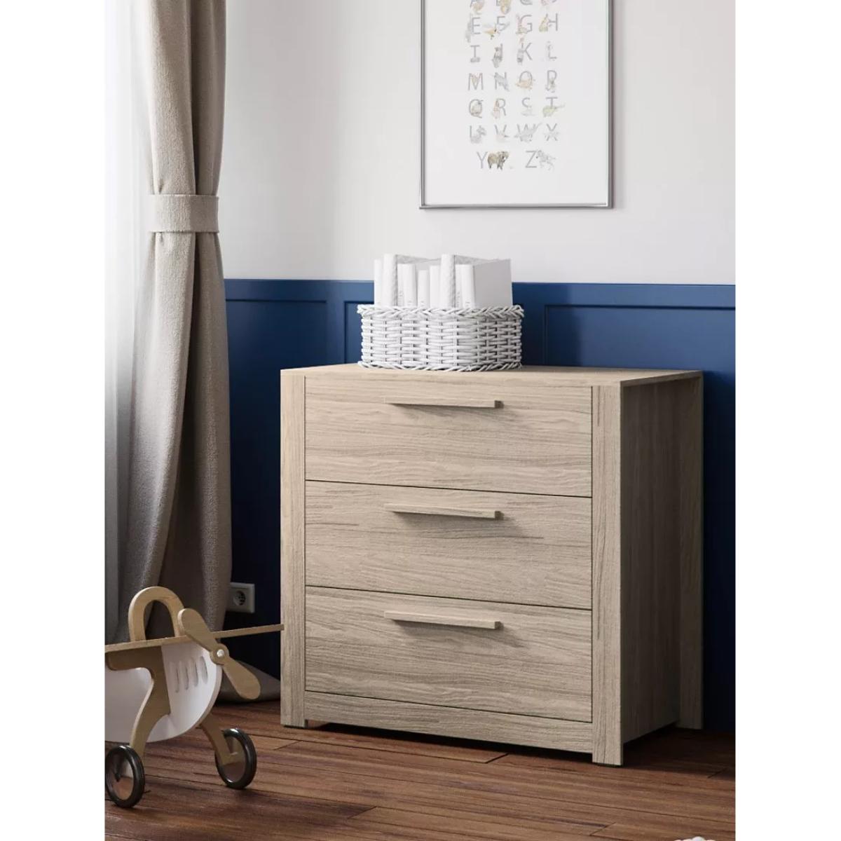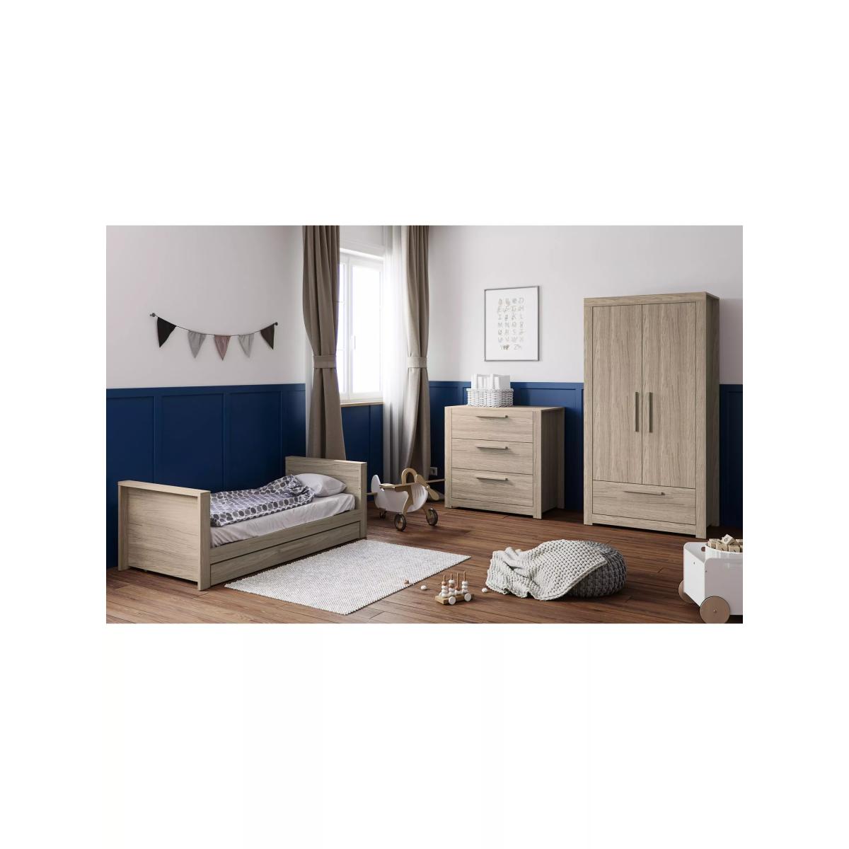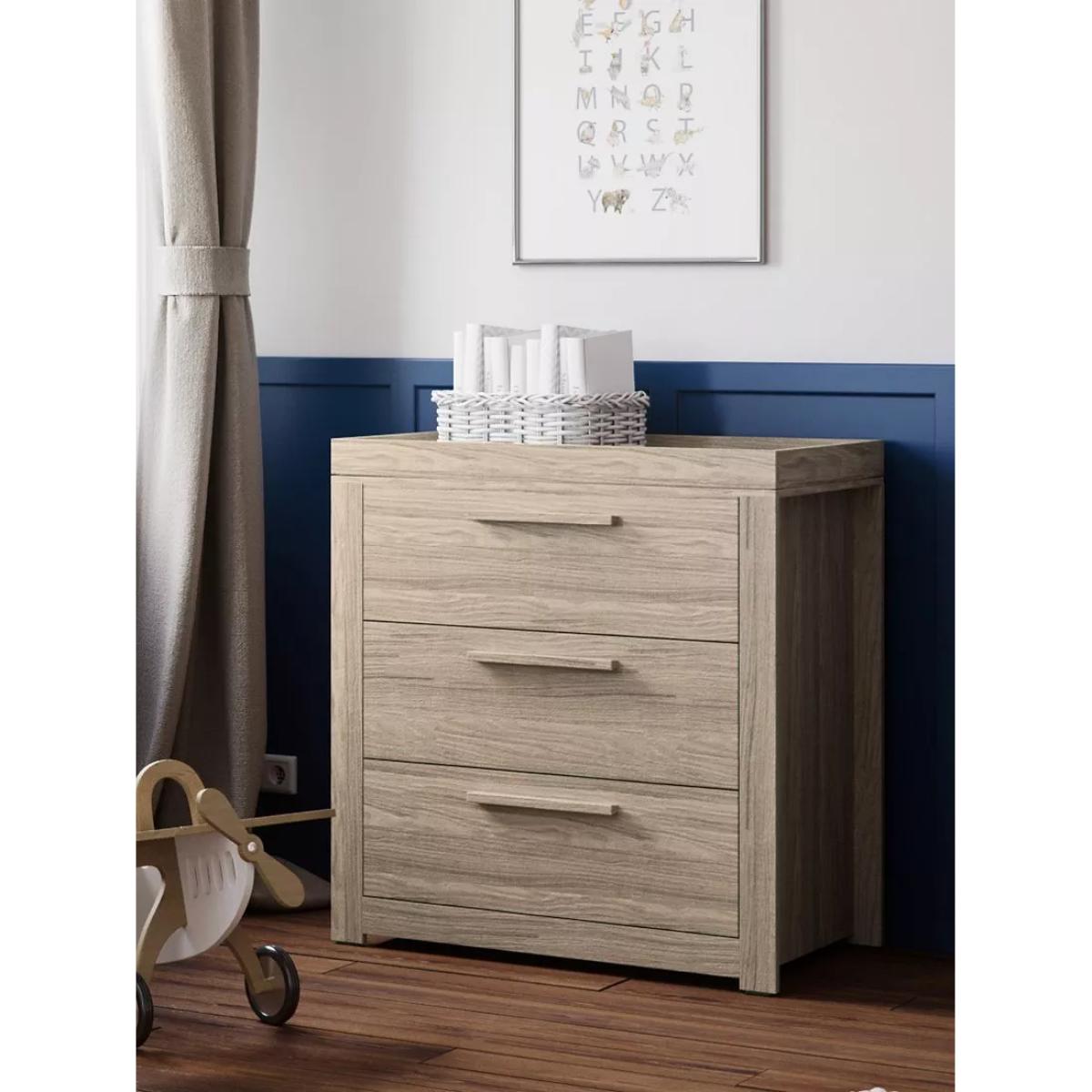 The contemporary design of the Ellesmere range from Little Acorns is sure to be a future classic with its extremely robust and solid design guaranteed to last. The robust but beautifully designed dresser is extremely versatile offering years of use. Initially as a changing unit offering a great height and a convenient place to change your little one. As little one gets bigger, the upper surround is removable and with its clever design converts to a regular Chest of Drawers leaving no visible holes. It has three deep and spacious drawers, each with its own reinforced metal bar to support the drawer bottom. Complete the look with the matching cot bed and double wardrobe, each sold separately.