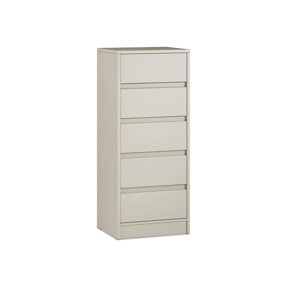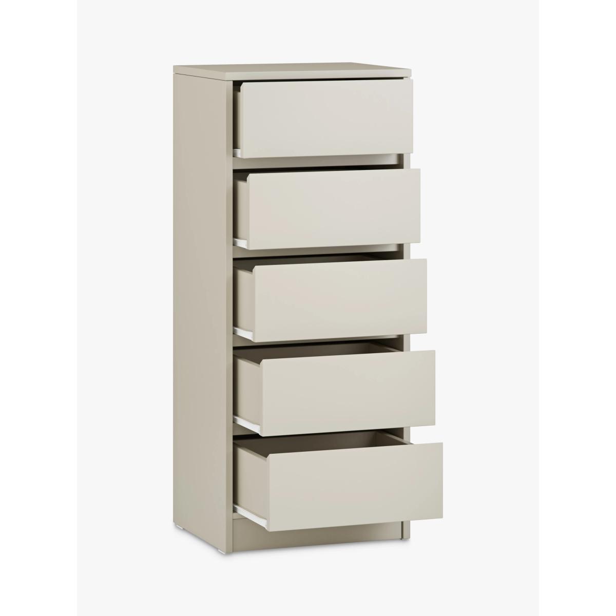I’m a fan of this slim five-drawer tallboy for its clean lines and compact footprint - it slots easily into hallways, bedrooms or a home office without overwhelming the space. The neutral finish works well in Scandi-inspired schemes or as a crisp contrast in a more colourful, eclectic room. For styling, I’d top it with a slim framed mirror or a small gallery ledge, plus a couple of potted succulents to add texture. Inside, use drawer dividers to keep linens, stationery or children’s clothes neatly organised, and consider layering a woven basket beside it for extra storage and a touch of warmth.