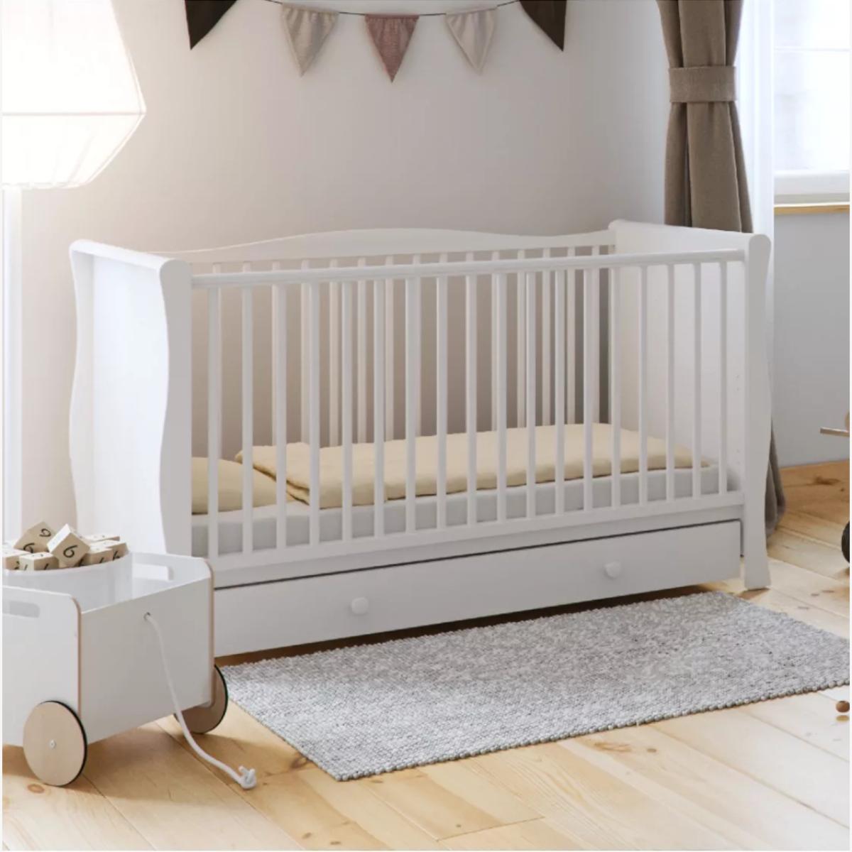 The Little Acorns Traditional Sleigh Cot has a classic, clean look featuring beautiful curved edges which is sure to compliment any nursery. With its sturdy construction, this beautiful cot has 2 mattress heights to adapt to your child as they grow. Plus, it's smaller size makes it ideal for tighter spaces. Mattress size required is 120 x 60cm, not included. Complete the look with other items from the Traditional Sleigh range.