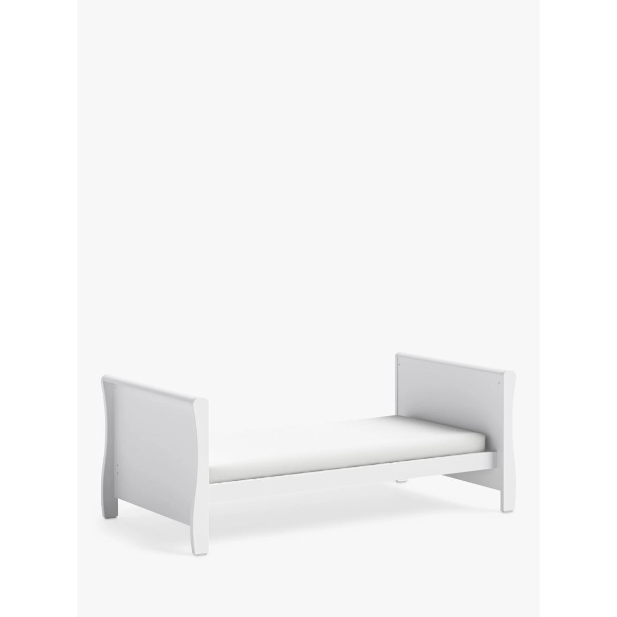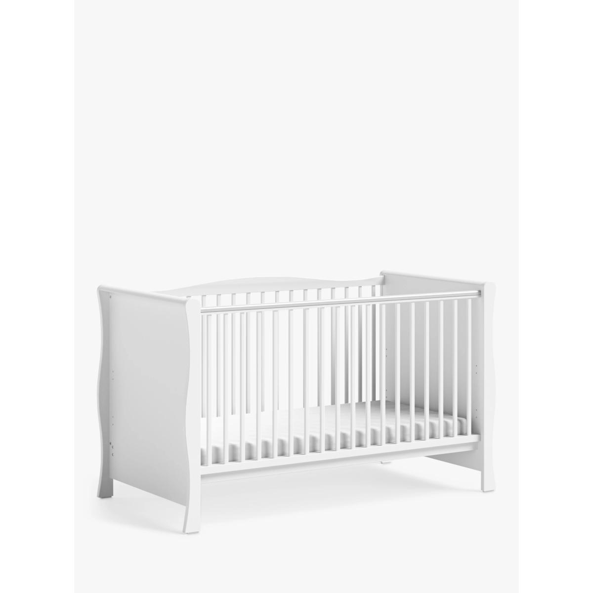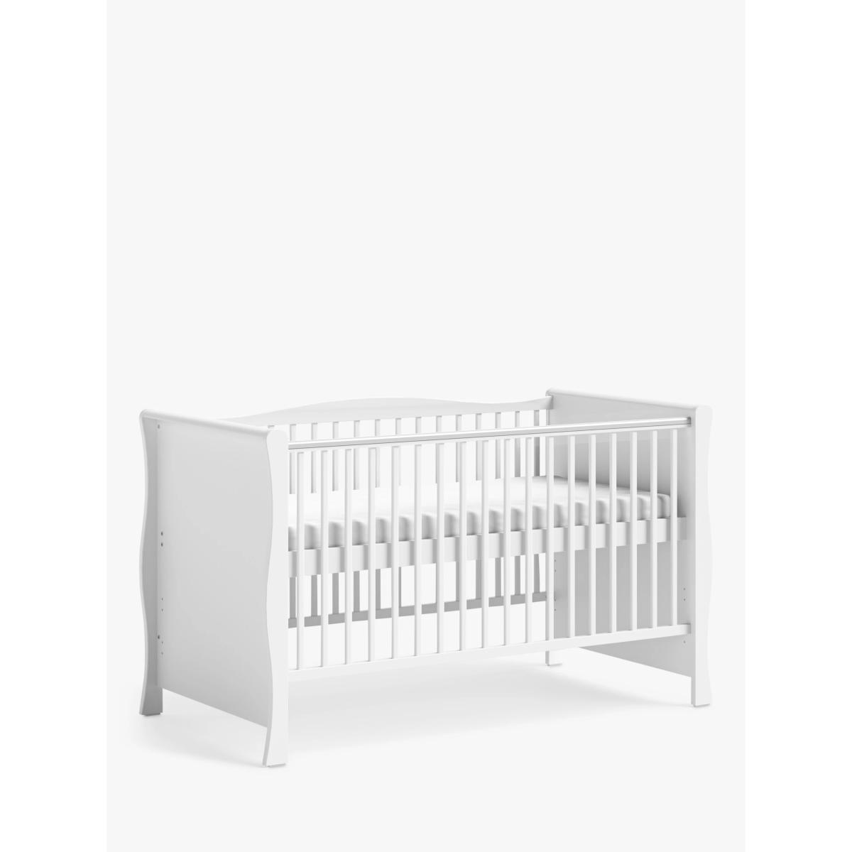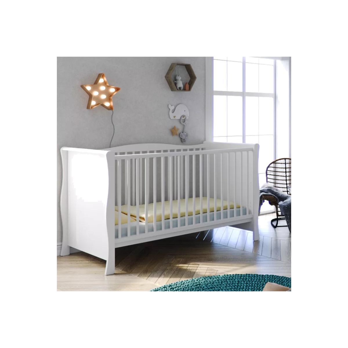 With a sleek, curved design and a crisp painted finish, the elegant Little Acorns Traditional Sleigh Cot Bed features 3 mattress heights which can be lowered as your baby grows. Once your child has outgrown the need for a cot, it can be conveniently transformed into a toddler bed for continued use up to approx. 4 years. Simply remove the side rails, split down the end panels and you're good to go. Key Features: Suitable from birth to approx. 4 years Converts to toddler bed Comes with teething rails Adjustable to 3 mattress heights A flexible piece, the bed can expanded with the compatible cotbed drawer (sold separately) to add some additional storage. Please note: Mattress size required: 140 x 70cm (not included).