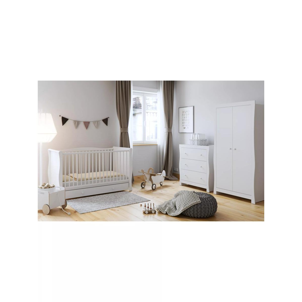 The Little Acorns sleigh-inspired underbed drawer is a charming addition for a nursery, especially perfect for a traditional or country-style interior. Its crisp white finish makes it versatile, blending seamlessly with both soft pastel palettes and timeless neutral schemes. I love how it maximises storage without sacrificing aesthetic, allowing you to keep essentials organised and easily accessible. For styling tips, pair it with a co-ordinating cot or crib with classic detailing, and consider adding personalised or textured textiles on top to soften the look. Practicality is key here, but with its clean design, it maintains a neat and cohesive nursery environment.