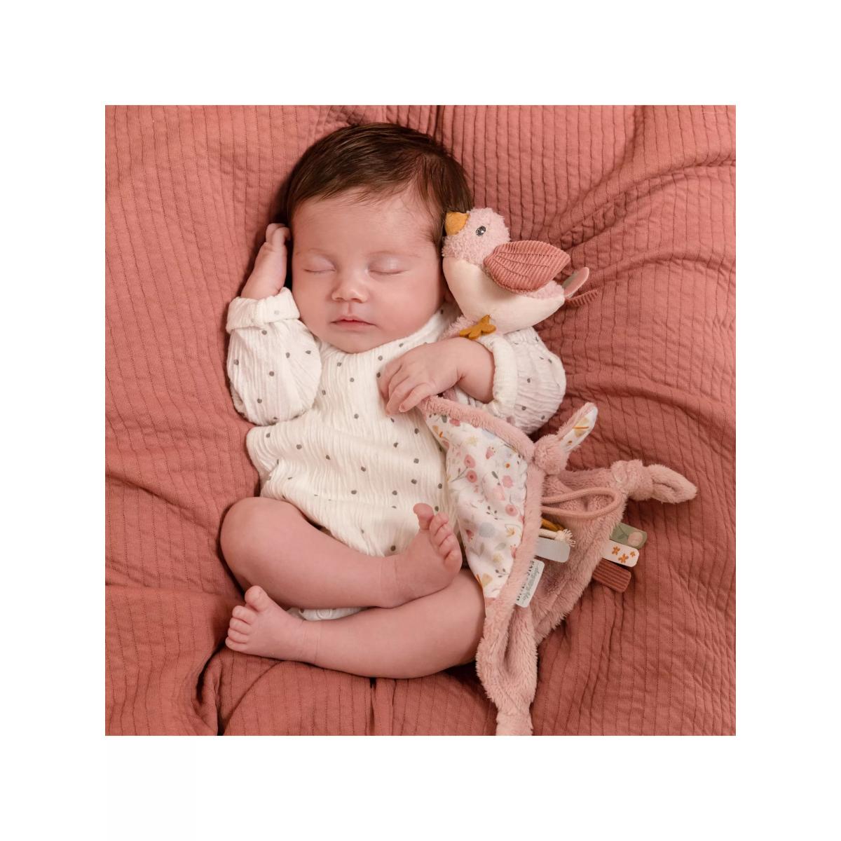 Soft and sweet. No nursery is complete without a comforting Cuddle Cloth close by. Dressed in Little Dutch's latest Flowers & Butterflies print, this soft-hued iteration of a tried-and-true newborn must-have features a little bird cuddle toy, easy-to-grab knots and fun labels to explore. It calms and helps a little one to fall asleep. Plus, you can attach a pacifier or teething ring to the cotton loop in the cloth. The comforter is suitable from birth and makes a great baby shower gift.