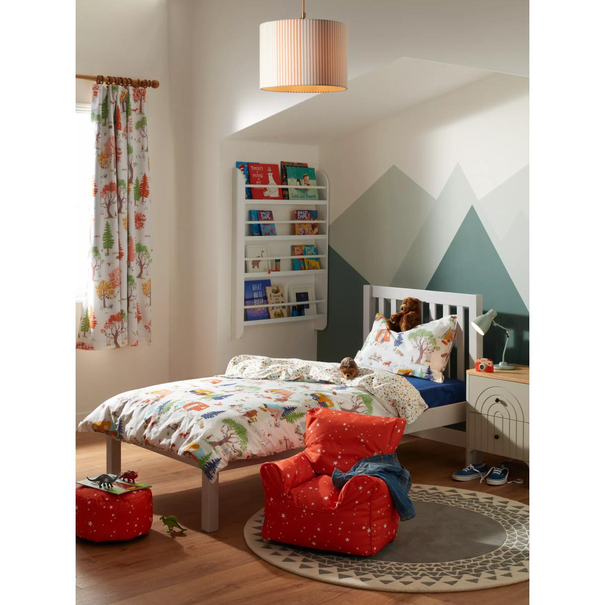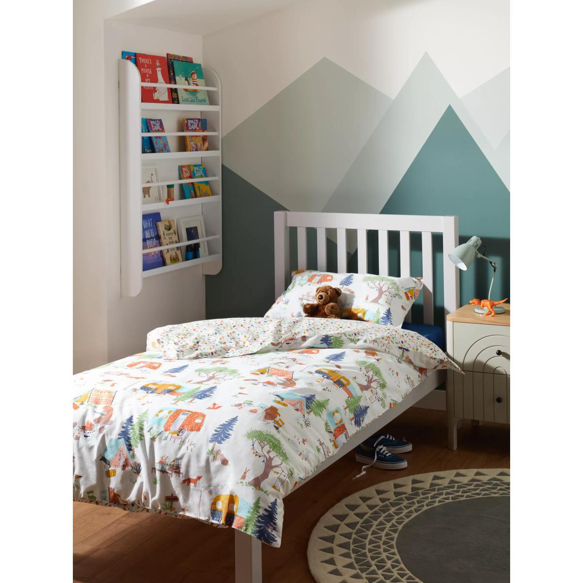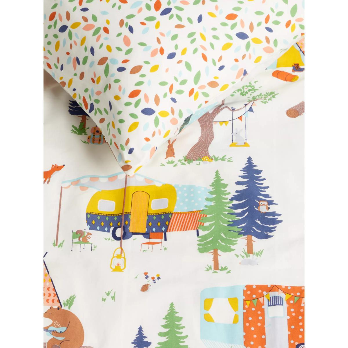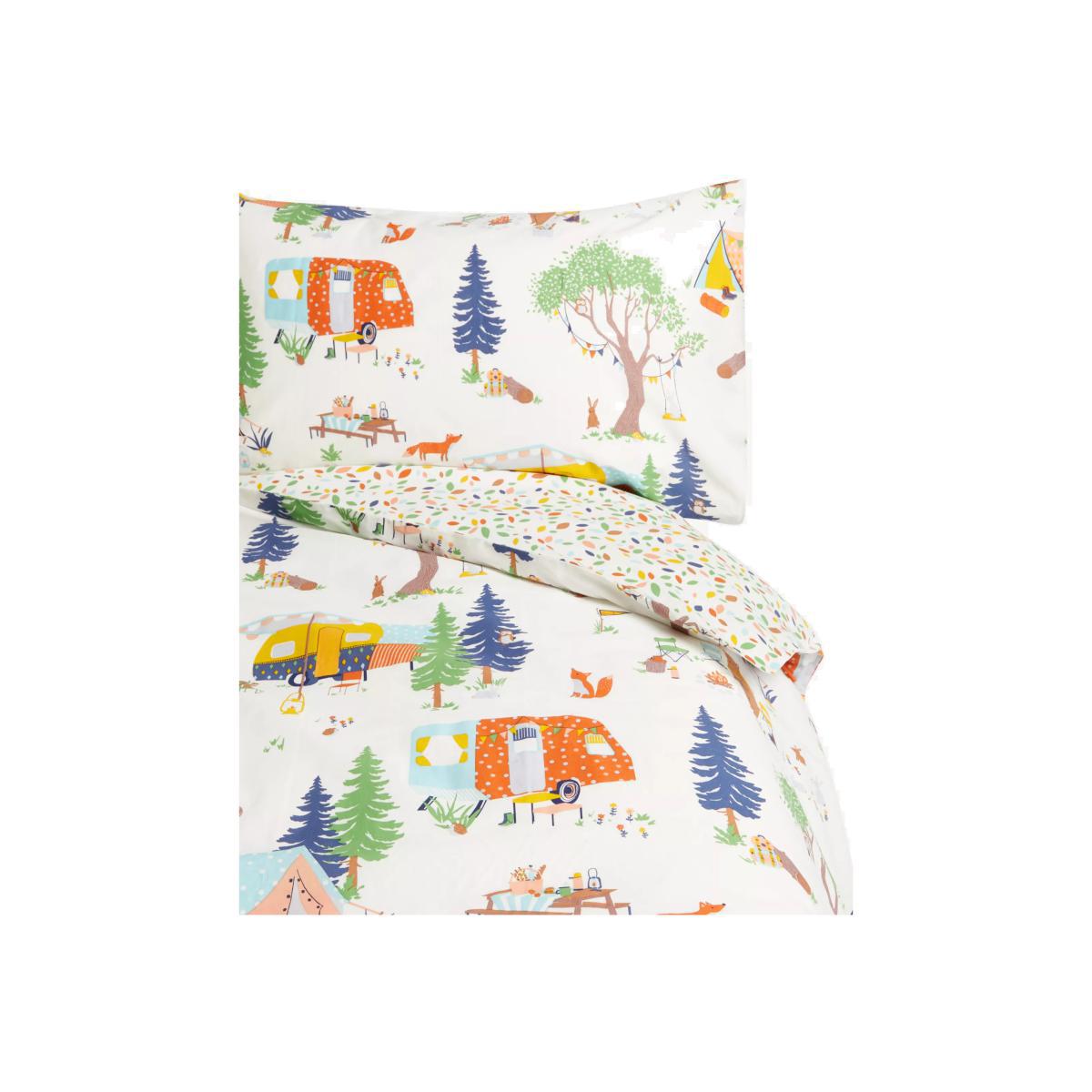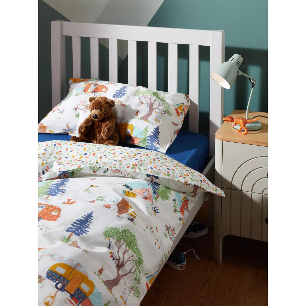 Designed with an array of bright colours, this pure cotton bedding set from our little home at John Lewis collection will add an attractive finish both you and your little one will love. Soft and breathable, with a 144 thread count and natural cotton construction, this bedding will keep them cool throughout the night while lending a colourful touch to their sleep space. Boasting a versatile reversible design, with a camping print on one side and a spotted leaves print on the reverse, this set is the perfect blend of delicate design and careful construction. This single set comes with one standard pillowcase. Standard pillowcase, L75 x W50cm Single duvet cover, L200 x W135cm Better Cotton By choosing our cotton products, you’re supporting our investment in Better Cotton’s mission to help cotton communities survive and thrive while protecting and restoring the environment. Better Cotton Farmers are farmers who care for the environment and respect workers’ rights and wellbeing. This product is sourced via a system of mass balance and therefore may not contain Better Cotton.