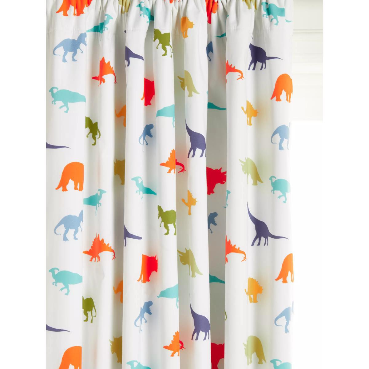 Made from pure cotton with an effective blackout coating, this pair of children's curtains are designed with our playful Dennis Dinosaur print. The pencil pleat design gives them a smart appearance and they'll love the vibrant colours on each dinosaur. There's a blackout coating which helps to block out distracting sun beams or street lights and the width dimension refers to the width of each individual curtain in the pair. Do you need a curtain pole and accessories? Shop.