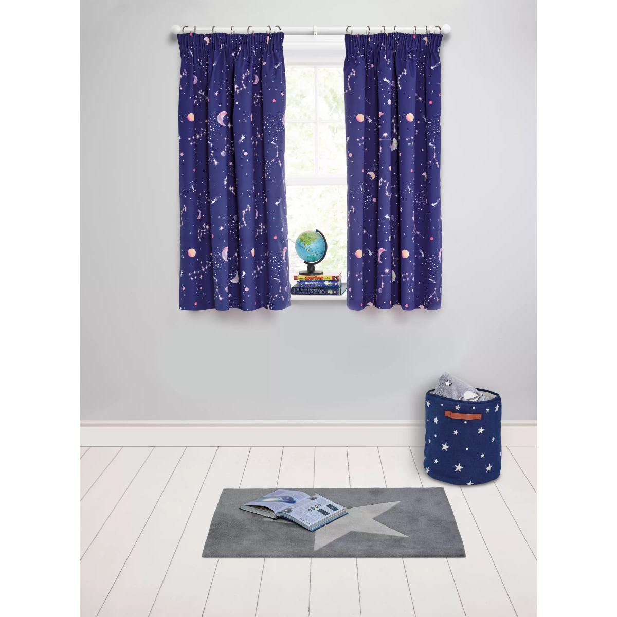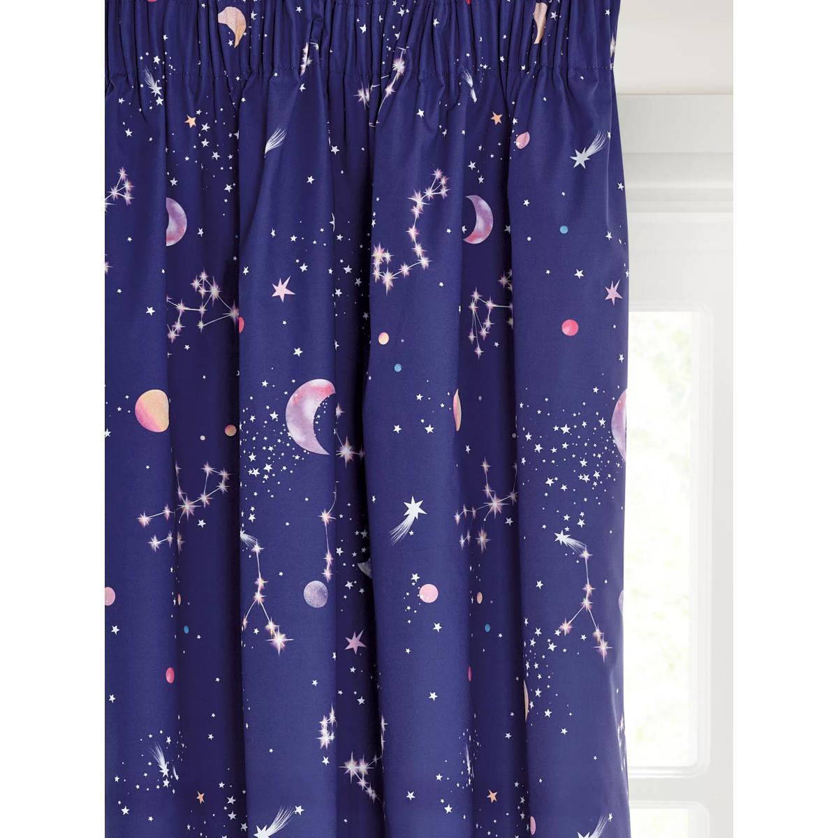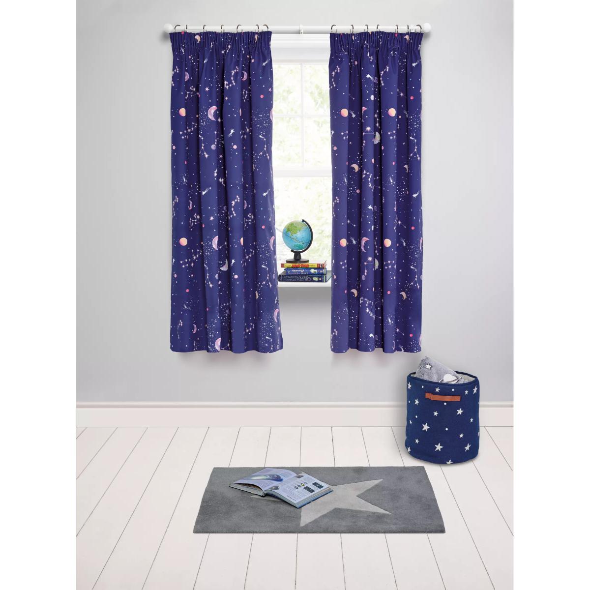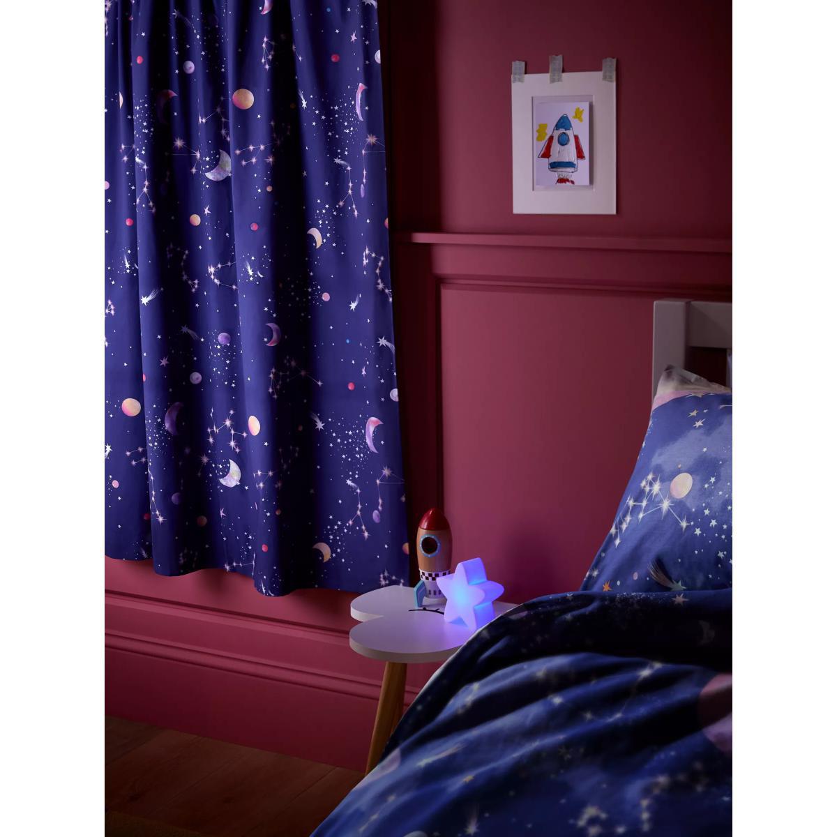 Printed with stars, constellations and moons that glow in the dark, these ready made children's curtains will draw the eye in their bedroom. Supplied as a pair, they're made from pure cotton and have an effective blackout coating that helps to block out distracting sun beams or street lights. Plus, the pencil pleats give them a smart finish. The glow in the dark feature is a playful and calming touch, especially if they're afraid of the dark. The width dimension refers to the width of each individual curtain in the pair. Do you need a curtain pole and accessories? Shop. Worth knowing The print glow ability is affected by light source and needs to be exposed to a substantial light source to glow. We recommend exposing these curtains in daylight for a minimum of 5-10 minutes to allow it to charge. If you are unable to charge in daylight, the effectiveness will be impacted by the light bulb being used, proximity to the light source and the length of time allowed to charge. We recommend using warm light bulbs for increased effectiveness. Please do not use cool white light bulbs to charge the curtains. By buying cotton products from John Lewis & Partners, you're supporting more sustainable cotton farming through the Better Cotton Initiative. BCI is a not-for-profit organisation which exists to make global cotton production better for the people who produce it, better for the environment it grows in, and better for the sector's future. BCI works with partners around the world such as WWF, Solidaridad and Cotton Connect to train farmers to produce cotton more sustainably. Better Cotton is sourced via a principle of "mass balance" and is not physically traceable to end products. However, BCI Farmers benefit from the demand for Better Cotton in equivalent volumes to those we source.