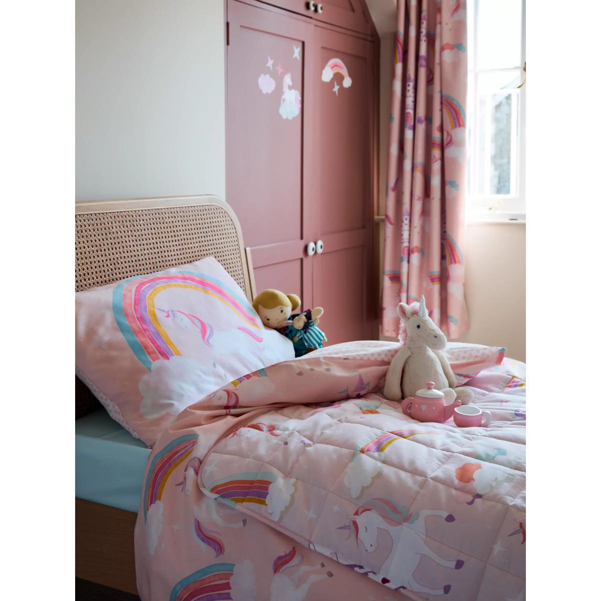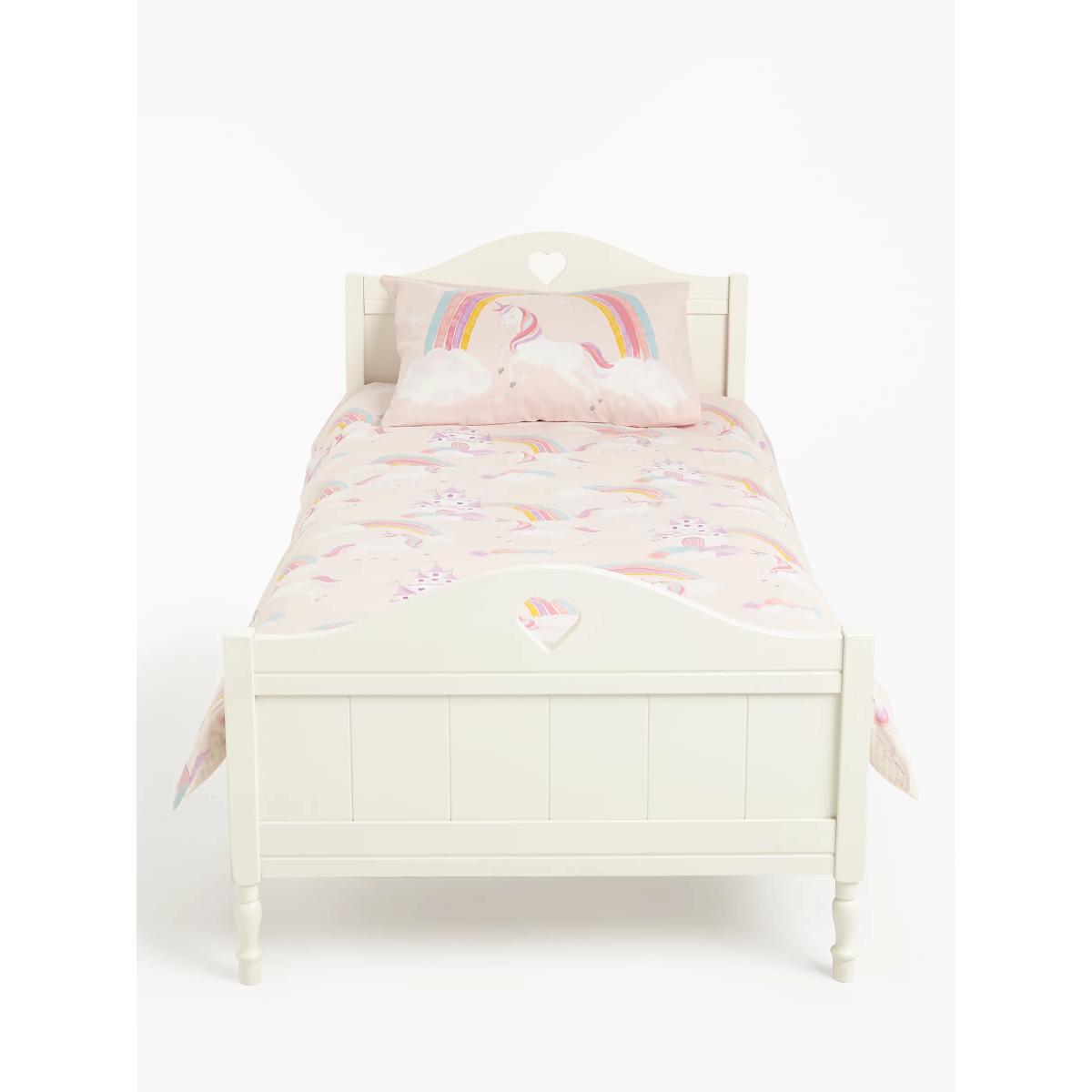 Create a magical, fantasy setting with our Magical Unicorn range. Designed with pastel pinks and rainbow colours, this assortment will keep them dreaming of a far-away land! This colourful duvet cover and pillowcase set is made from soft and naturally breathable cotton. Printed with castles, unicorns and all things fantasy on one side, its reverse features a versatile polka dot print, allowing you to change their sleep space after every wash! Good to know: The single set comes with one standard pillowcase and the double set comes with two standard pillowcases. To fit duvet/pillow size (cm) Standard pillowcase, L75 x W50cm Single duvet cover, L200 x W135cm Double duvet cover, L200 x W200cm More Sustainably Sourced The cotton in this bedding has been produced in line with the Better Cotton Initiative (BCI). This is a not-for-profit organisation which exists to ‘make global cotton production better for the people who produce it, better for the environment it grows in, and better for the sector’s future. BCI works with partners around the world such as WWF, Solidaridad and Cotton Connect to train farmers to produce cotton more sustainably. By buying cotton products from John Lewis & Partners, you’re supporting the training of these farmers to use water efficiently, care for the health of the soil and natural habitats, reduce the use of the most harmful chemicals and apply principles of fair and decent work.