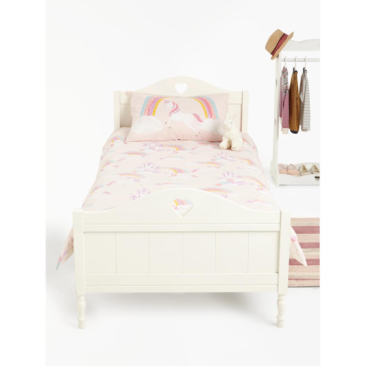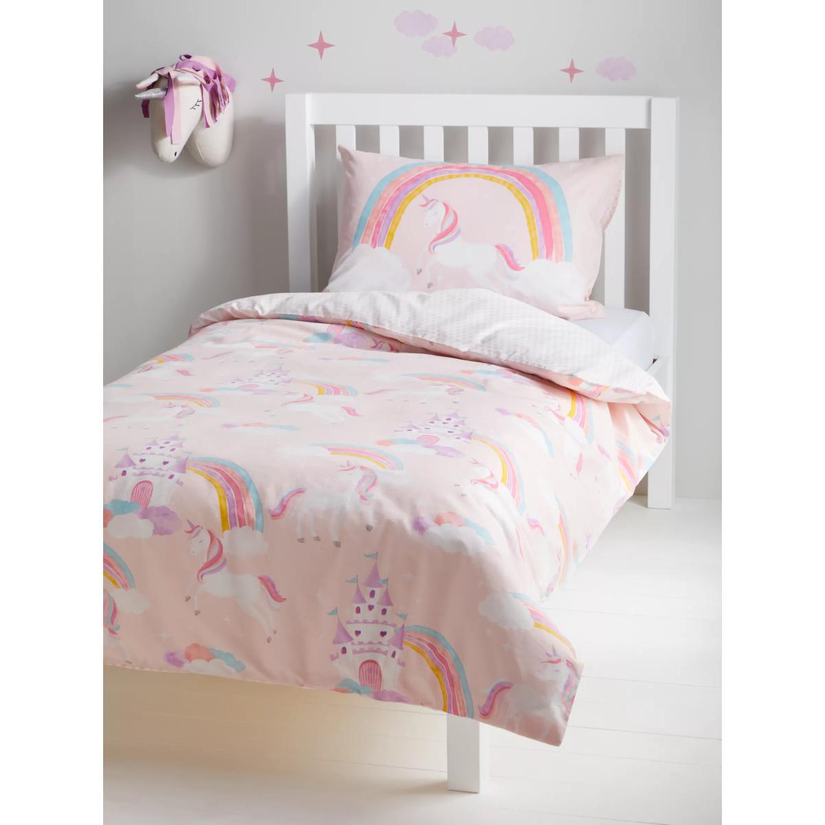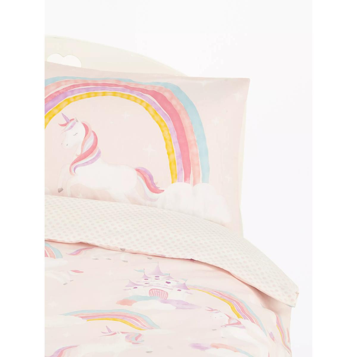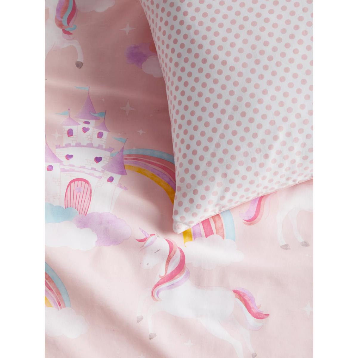 Create a magical, fantasy setting with our Magical Unicorn range. Designed with pastel pinks and rainbow colours, this assortment will keep them dreaming of a far-away land! This colourful duvet cover and pillowcase set is made from soft and naturally breathable cotton. Printed with castles, unicorns and all things fantasy on one side, its reverse features a versatile polka dot print, allowing you to change their sleep space after every wash! Good to know: The single set comes with one standard pillowcase and the double set comes with two standard pillowcases. To fit duvet/pillow size (cm) Standard pillowcase, L75 x W50cm Single duvet cover, L200 x W135cm Double duvet cover, L200 x W200cm More Sustainably Sourced The cotton in this bedding has been produced in line with the Better Cotton Initiative (BCI). This is a not-for-profit organisation which exists to ‘make global cotton production better for the people who produce it, better for the environment it grows in, and better for the sector’s future. BCI works with partners around the world such as WWF, Solidaridad and Cotton Connect to train farmers to produce cotton more sustainably. By buying cotton products from John Lewis & Partners, you’re supporting the training of these farmers to use water efficiently, care for the health of the soil and natural habitats, reduce the use of the most harmful chemicals and apply principles of fair and decent work.