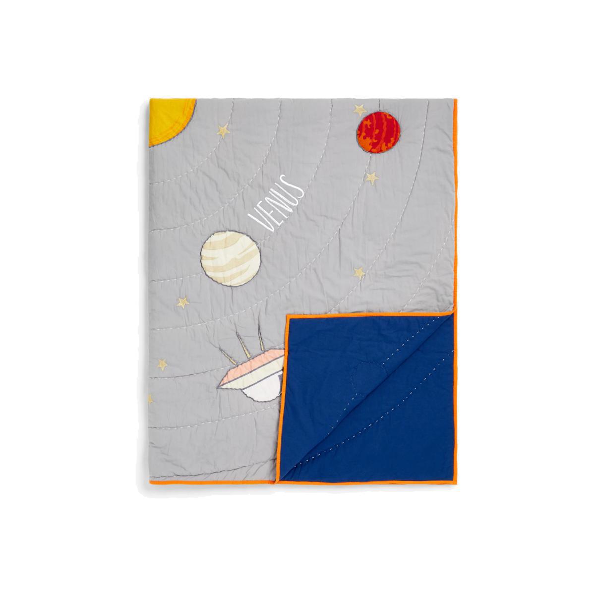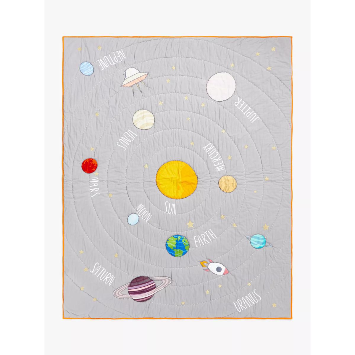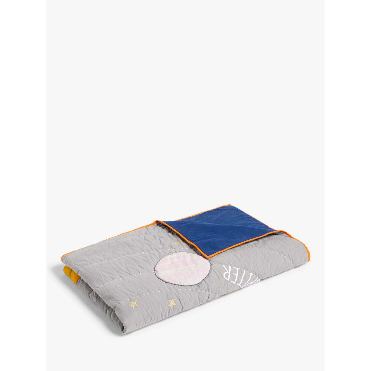 Astronomy isn't just for the textbooks. Your budding astronauts will love our Outer Space range with its colourful portrayal of the solar system and its many stars and planets. This cosy quilt is made from pure cotton and is the perfect layer for their bed on chilly nights. With a labelled solar system on one side, they can learn the differences between each planet. The contrasting plain reverse and vibrant trim provides two different design styles for their bedroom. More Sustainably Sourced The cotton in this quilt has been produced in line with the Better Cotton Initiative (BCI). This is a not-for-profit organisation which exists to ‘make global cotton production better for the people who produce it, better for the environment it grows in, and better for the sector's future. BCI works with partners around the world such as WWF, Solidaridad and Cotton Connect to train farmers to produce cotton more sustainably. By buying cotton products from John Lewis & Partners, you're supporting the training of these farmers to use water efficiently, care for the health of the soil and natural habitats, reduce the use of the most harmful chemicals and apply principles of fair and decent work.